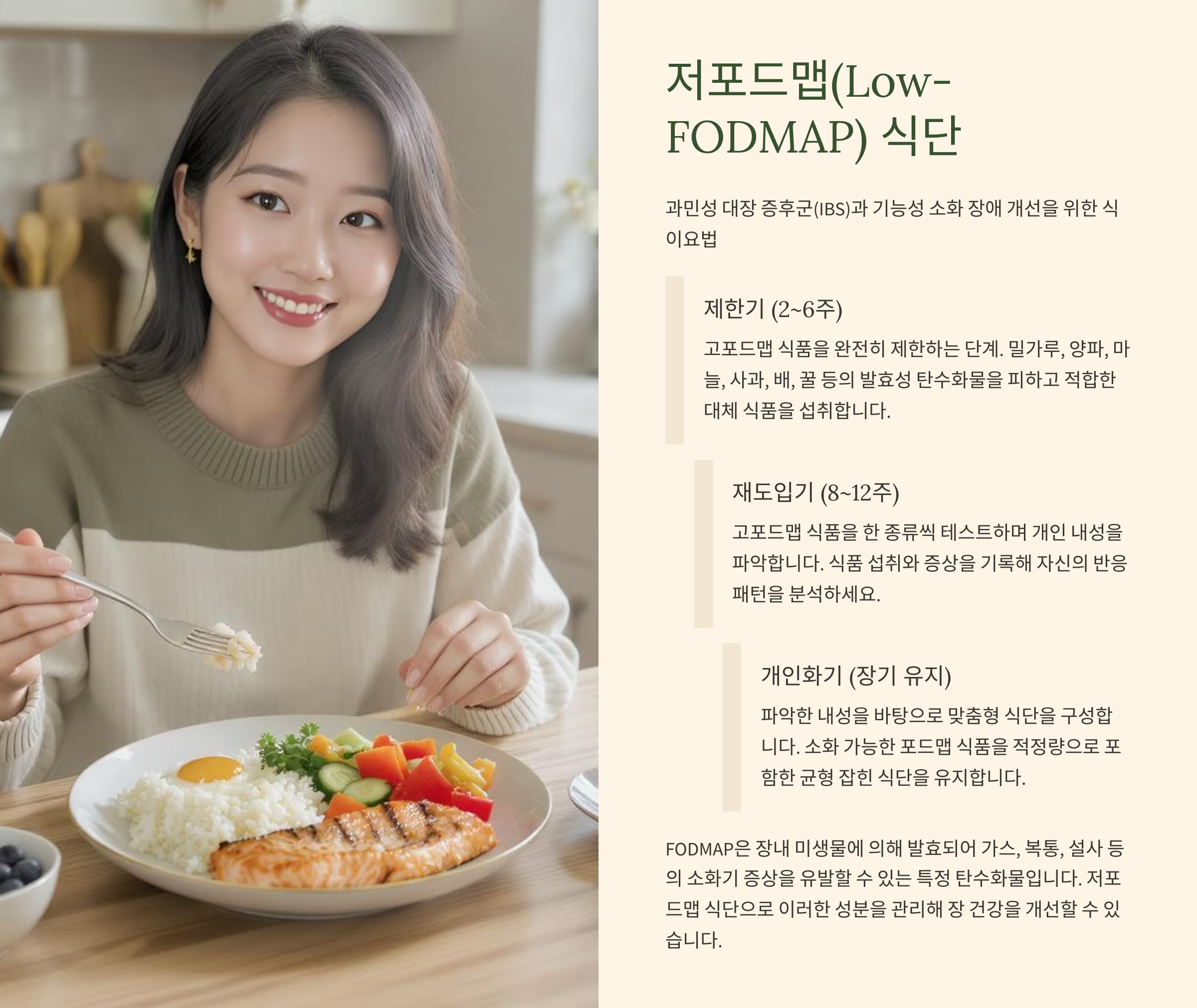 저포드맵 식단의 구성과 단계별 실천법을 설명하며 과민성 대장증후군(IBS)에 효과적인 식사 접근을 제안하는 이미지입니다.