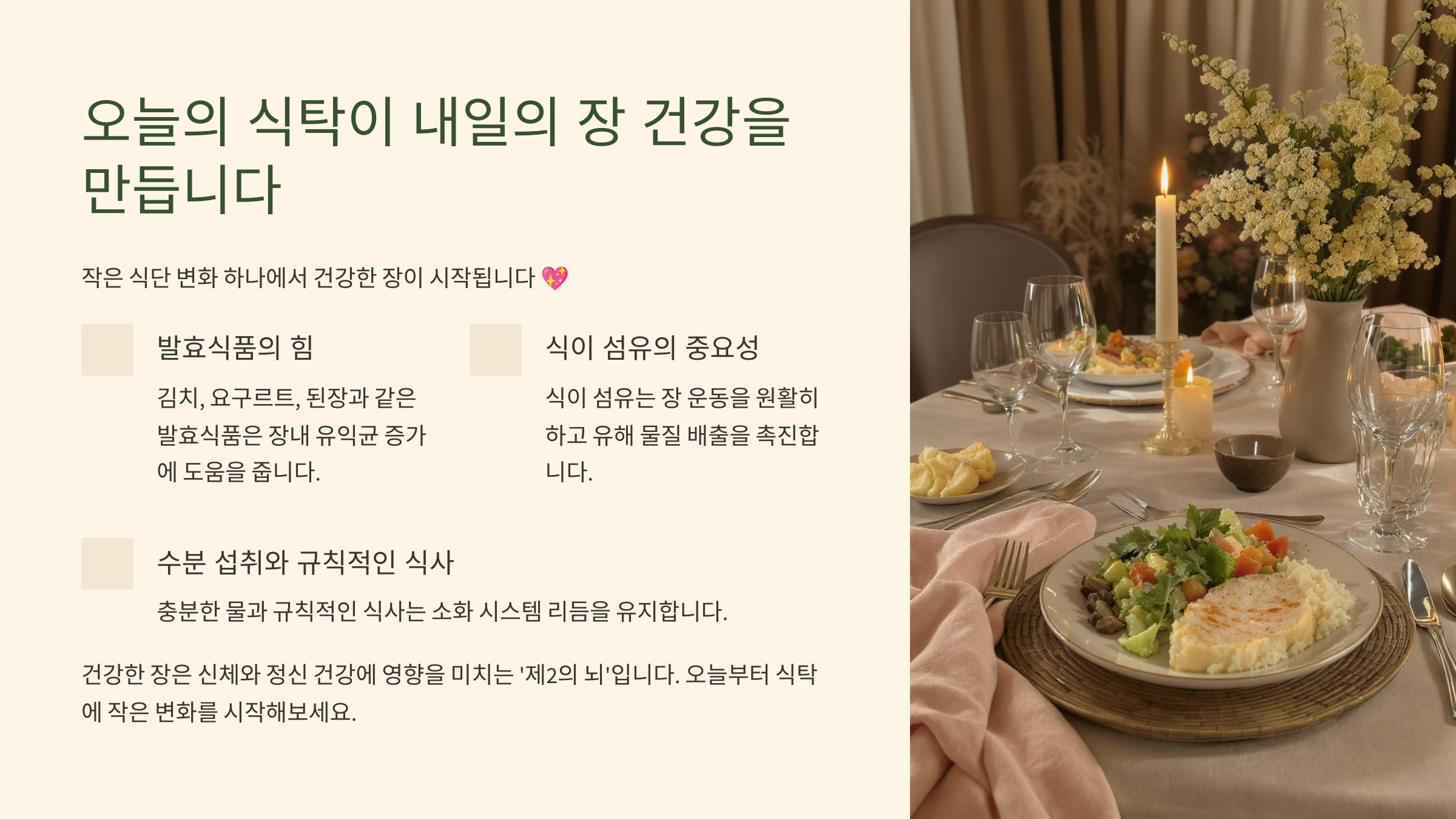발효식품과 섬유소 섭취, 규칙적인 식사가 장 건강을 지키는 핵심 습관임을 따뜻한 식탁 이미지와 함께 전달하는 에필로그 콘텐츠입니다.