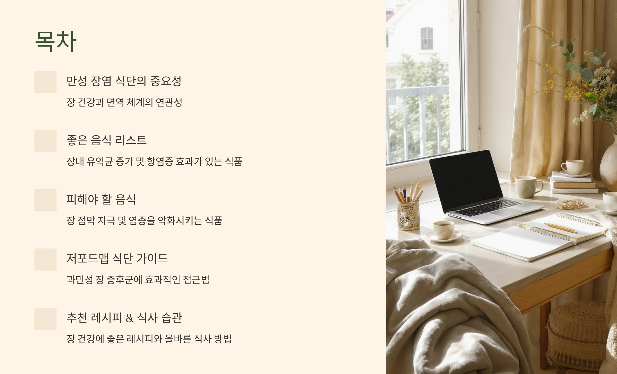 장 건강 식단의 핵심 항목과 저포드맵 가이드 등 실천 가능한 식이요법 내용을 소개하는 목차 이미지입니다.