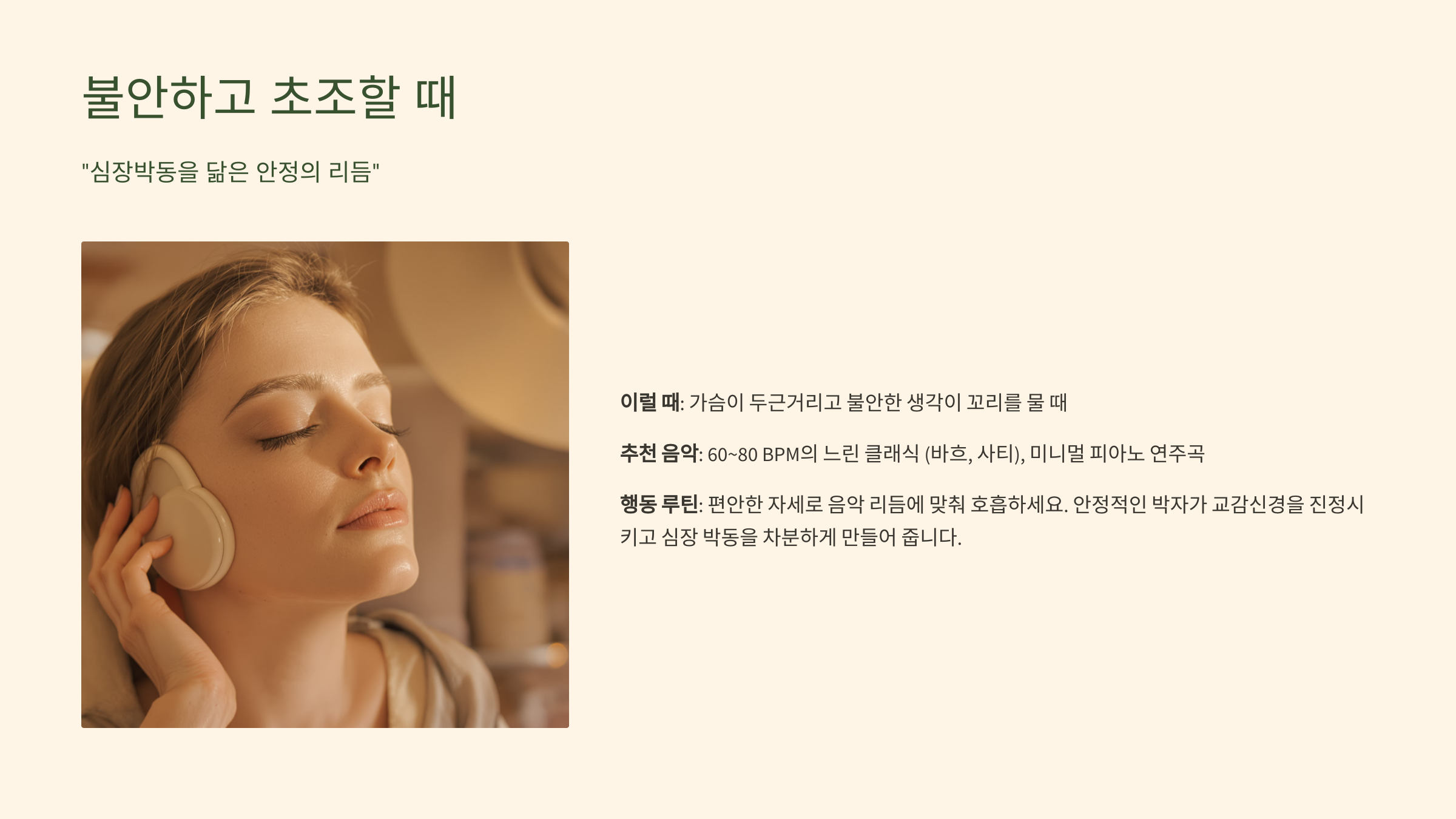 심박수와 비슷한 리듬의 음악이 불안 완화에 도움을 준다는 과학적 근거를 소개하는 실전 이미지입니다.