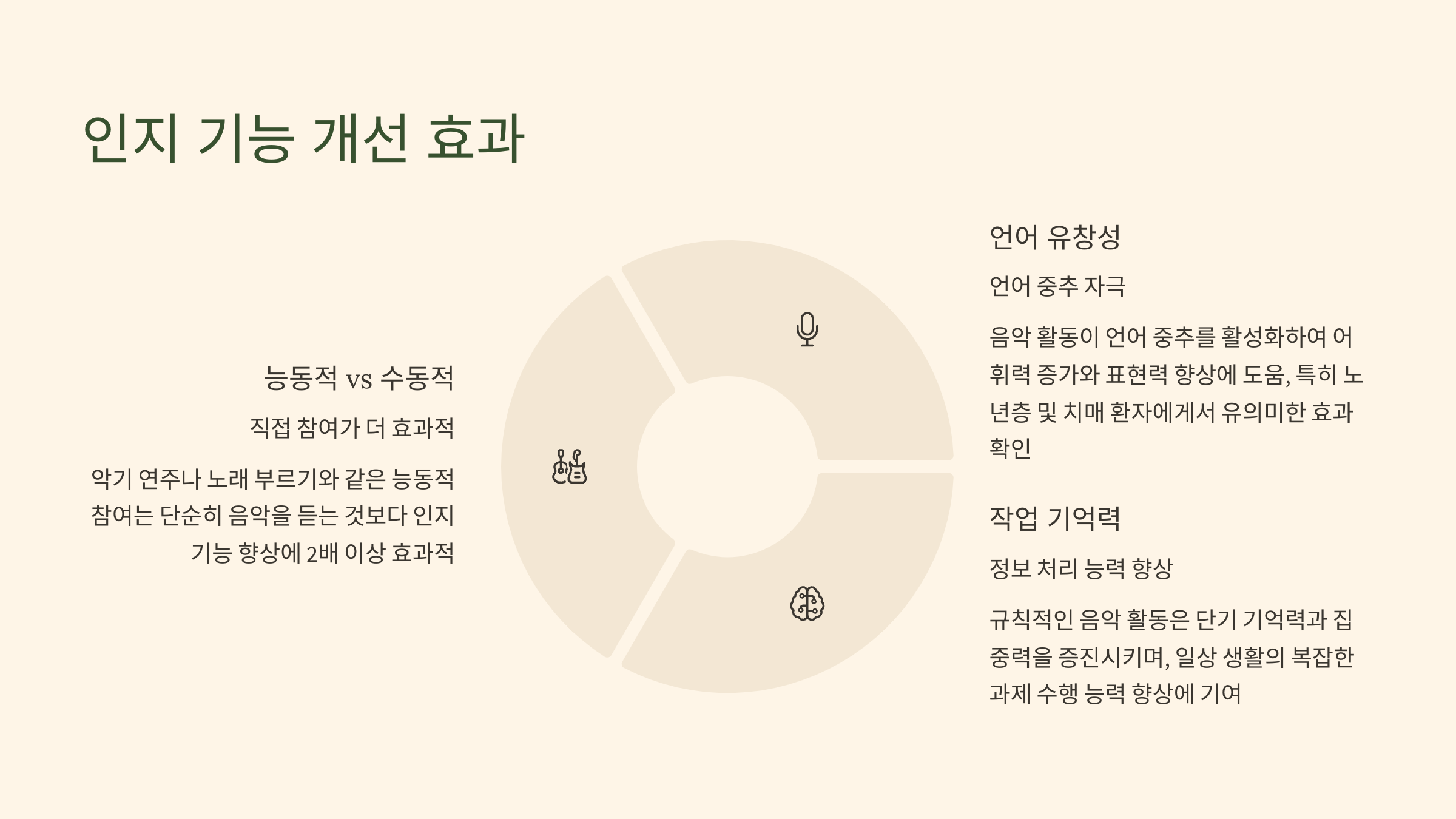 단순히 음악을 듣는 '수동적 치료'도 효과가 있지만, 환자가 직접 노래를 부르거나 악기를 연주하는 '능동적 치료'는 뇌를 더욱 복합적으로 자극하여 인지 기능 개선에 더 큰 도움이 되는 것으로 알려져 있습니다. 계획하고, 실행하고, 기억하는 과정이 모두 포함되기 때문입니다.