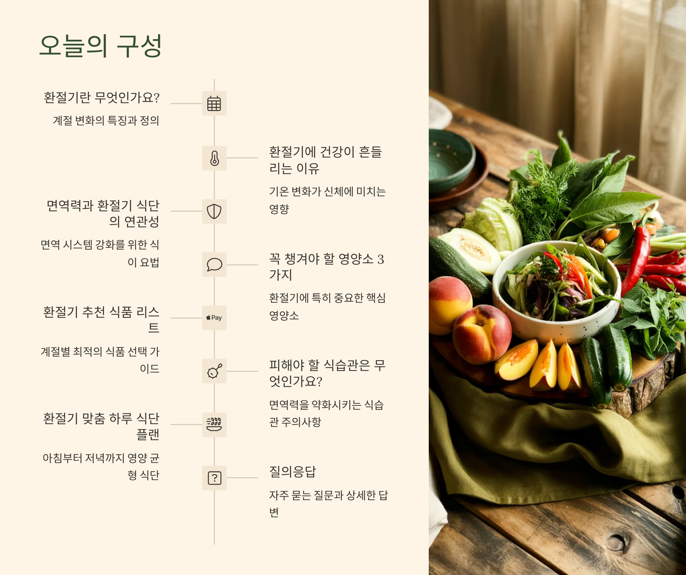 A: 비타민 C 외에도 아연, 수분 섭취, 균형식이 필요합니다. - Q3. 아이들 환절기 식단은 어떻게 해야 하나요?