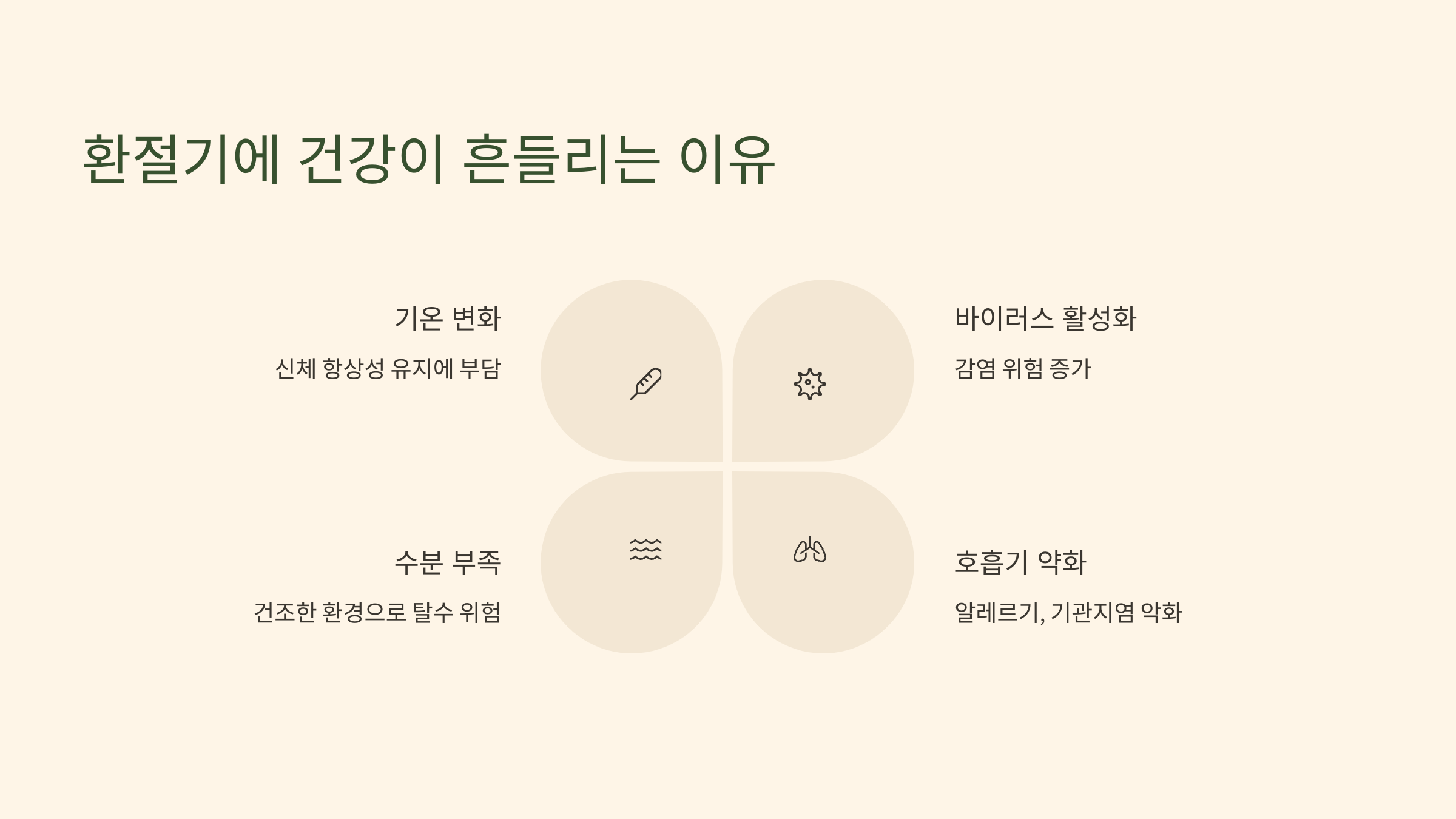 급격한 기온 차는 신체 항상성 유지에 부담을 줍니다. 피부, 호흡기 점막이 건조해지고, 바이러스 활동이 활발해져 감염 위험이 증가합니다. 또 알레르기성 질환이나 기관지염 같은 호흡기 질환도 이 시기에 악화되기 쉽습니다. 특히 수분 섭취 부족, 영양 불균형이 건강 악화를 가속화할 수 있습니다.