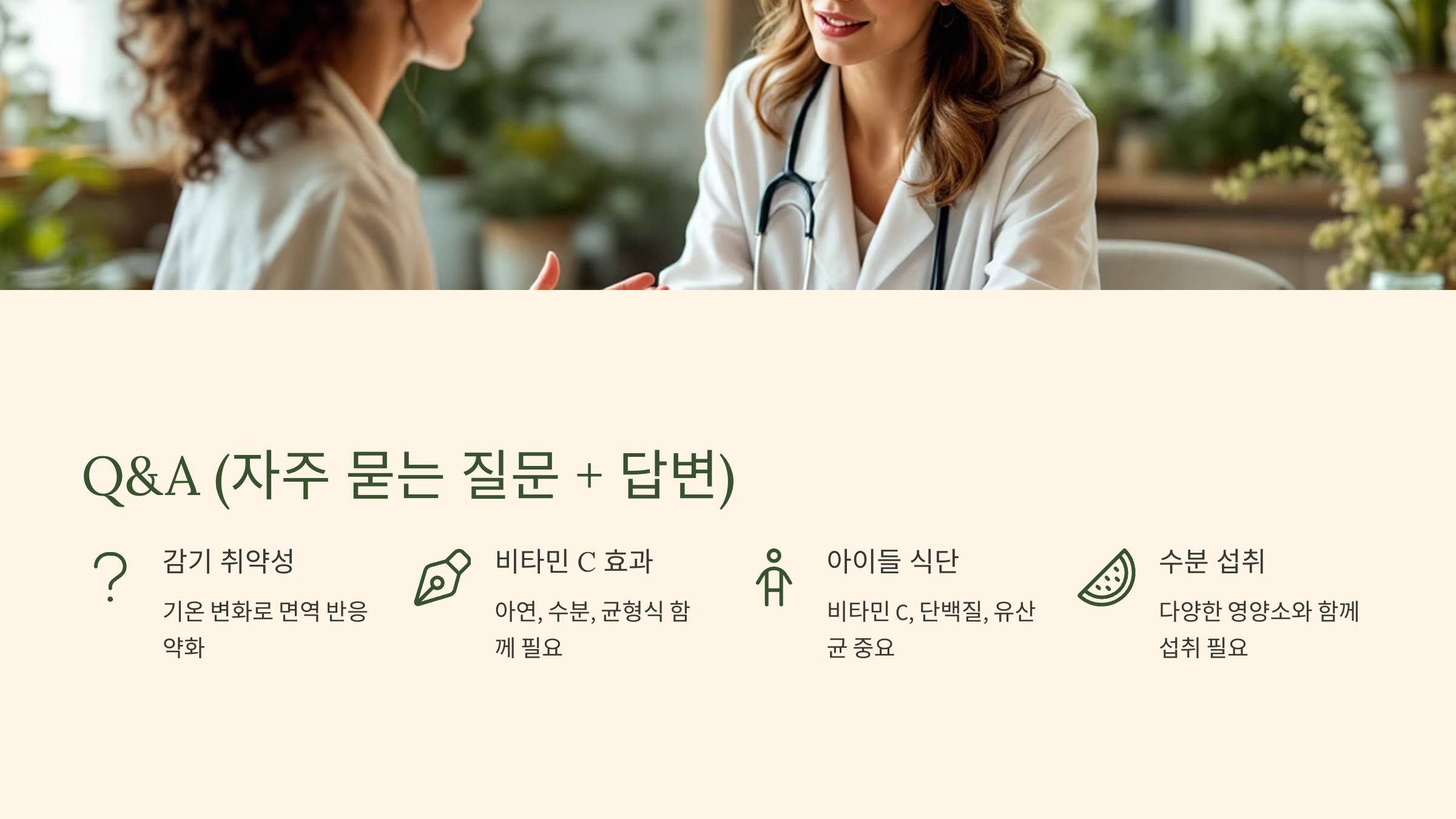 A: 비타민 C 외에도 아연, 수분 섭취, 균형식이 필요합니다.