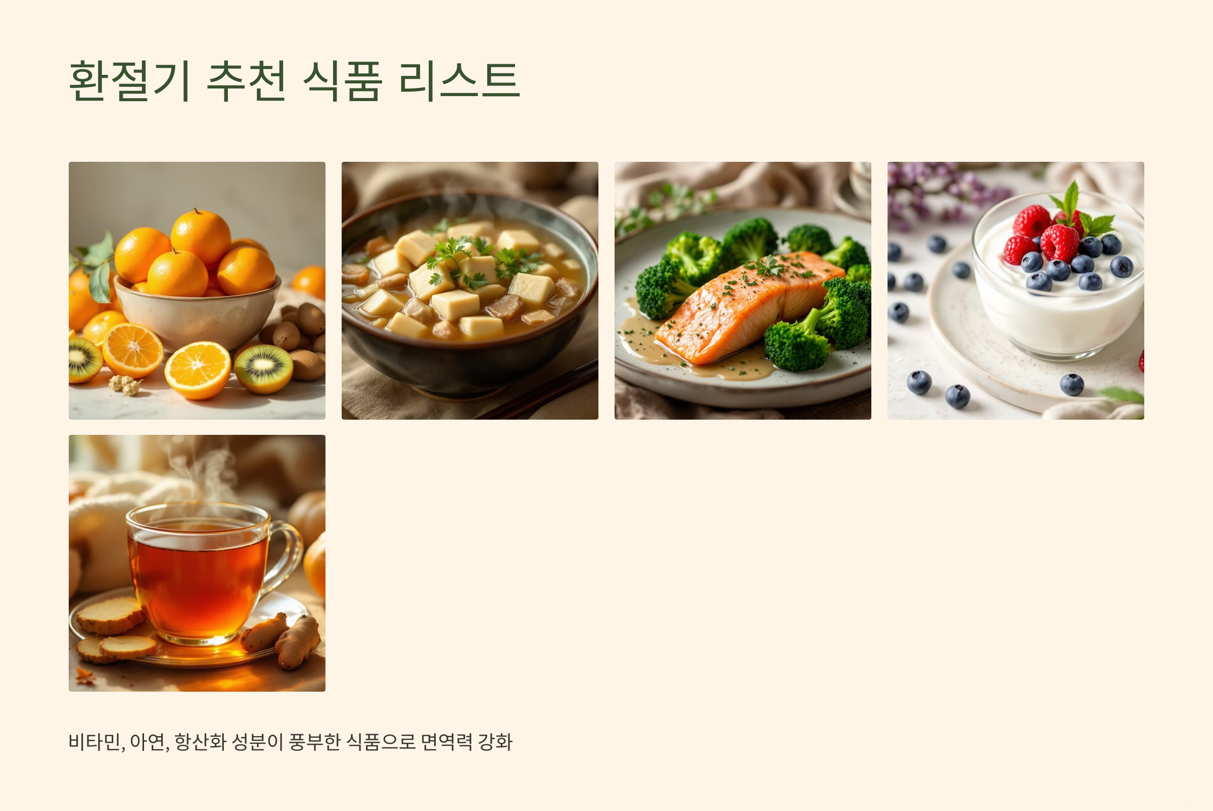 귤, 키위, 브로콜리, 요거트, 생강차, 된장국, 연어, 토마토 등이 추천됩니다. 이 식품들은 비타민, 아연, 항산화 성분이 풍부하여 환절기 면역력 강화에 큰 도움이 됩니다.