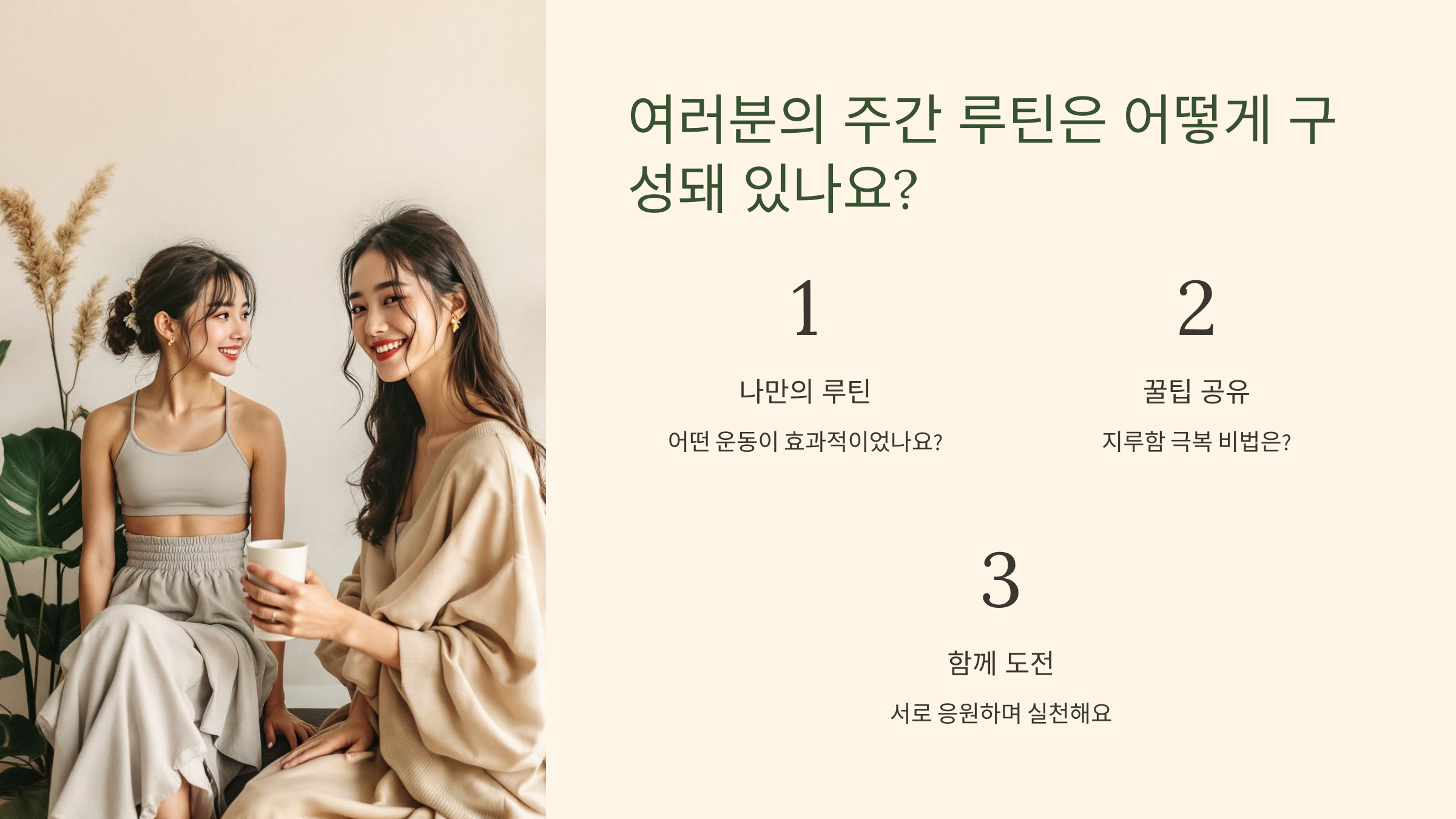 혹시 꾸준히 실천하고 있는 나만의 운동 루틴이나 꿀팁이 있다면 댓글로 자유롭게 공유해주세요! 어떤 운동이 가장 효과적이었는지, 지루함을 극복하는 나만의 비법은 무엇인지 함께 이야기 나누면 서로에게 큰 동기 부여가 될 거예요. 😊