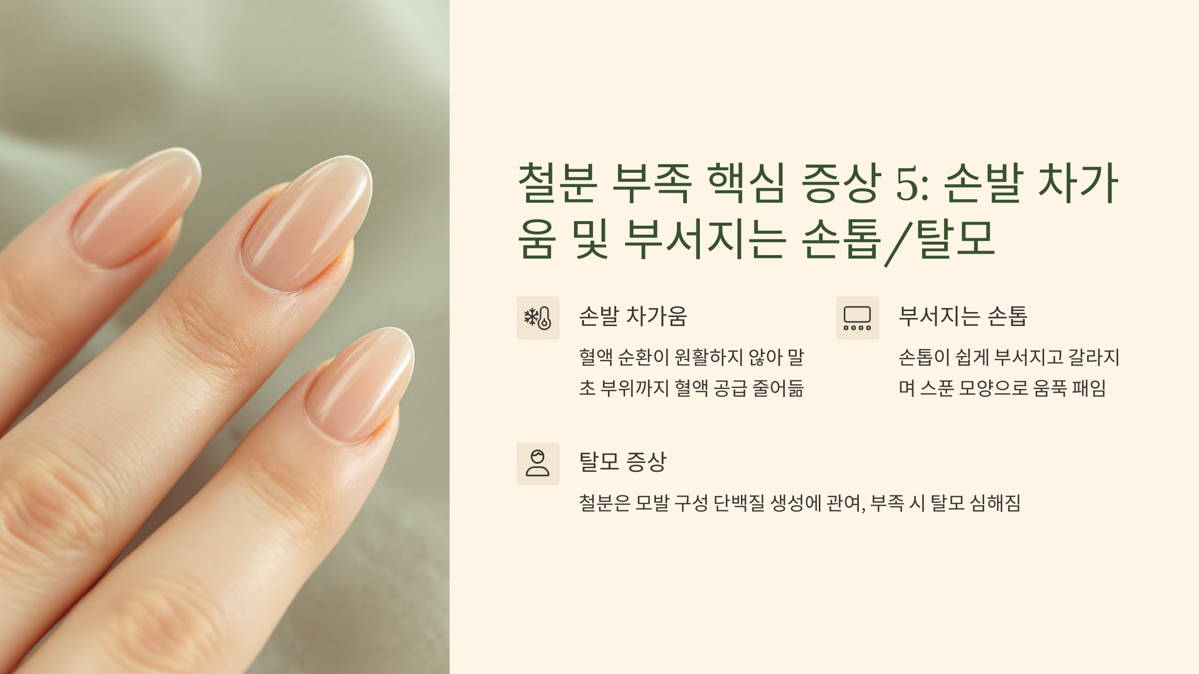 - 철분 부족 핵심 증상 5: 손발 차가움 및 부서지는 손톱/탈모