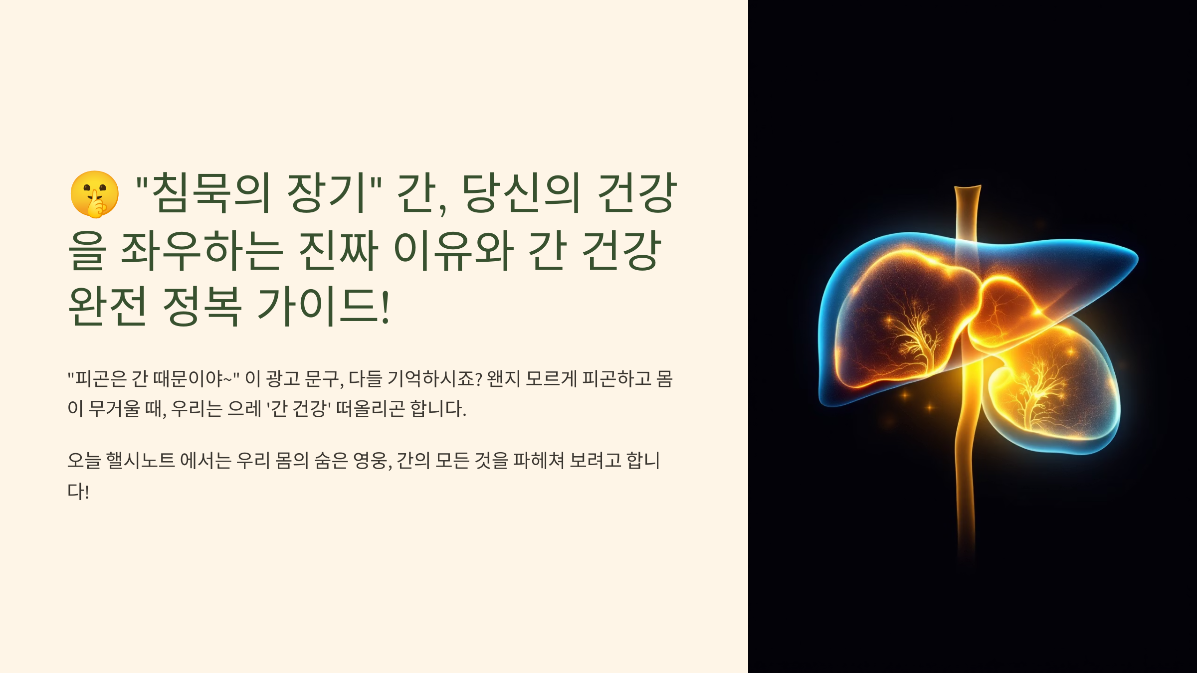 오늘 핼시노트에서는 우리 몸의 숨은 영웅, 간의 모든 것을 파헤쳐 보려고 합니다! 간이 하는 놀라운 역할부터 간 건강을 위협하는 적신호, 그리고 일상생활에서 쉽게 실천할 수 있는 간 건강 완전 정복 비법까지! 지금부터 함께 알아보시죠! (대한간학회, 질병관리청 등 공신력 있는 기관 자료 참고)
