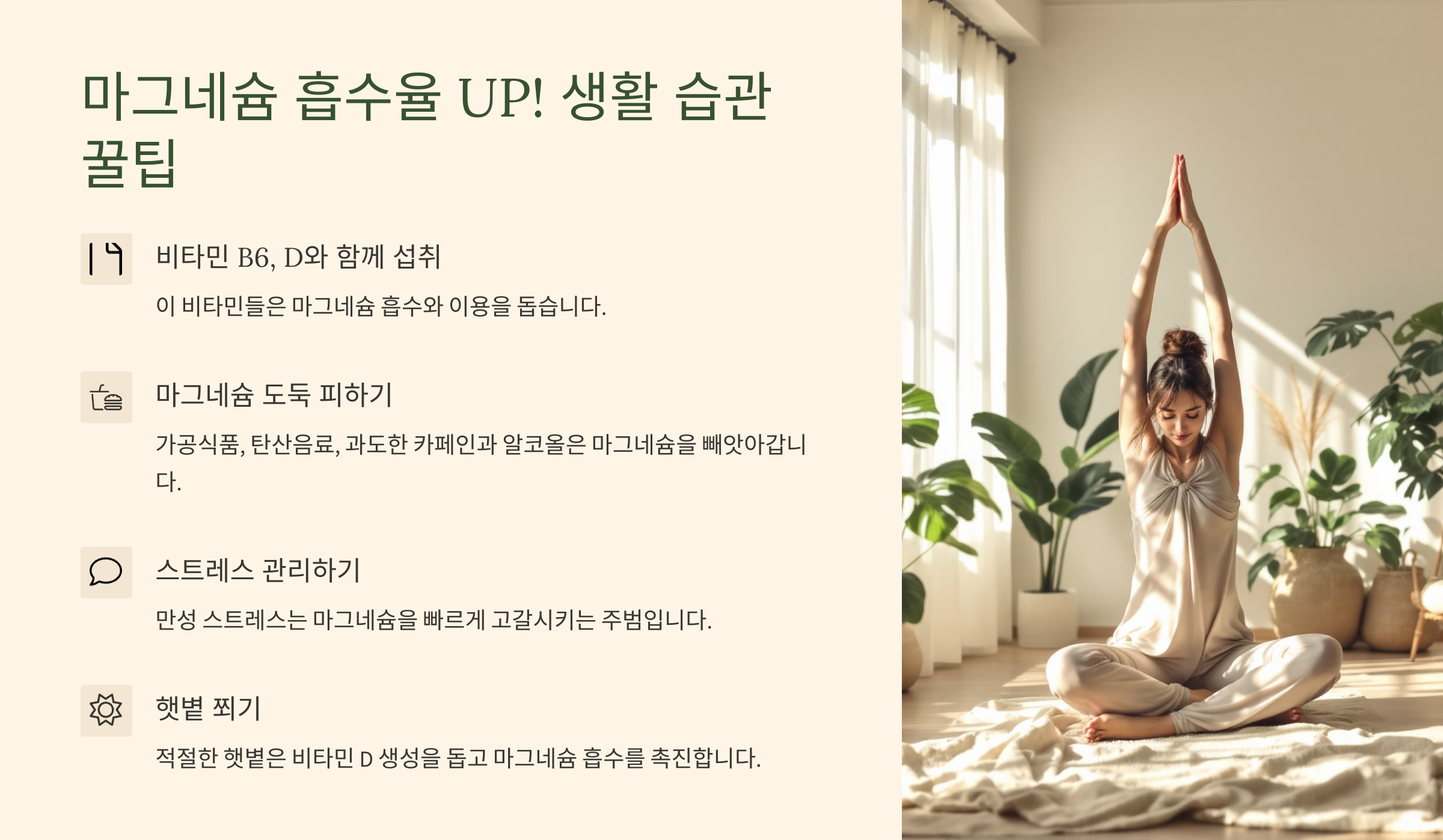 - 마그네슘 흡수율 UP! & 체내 소모 줄이는 '생활 습관' 꿀팁 ✨