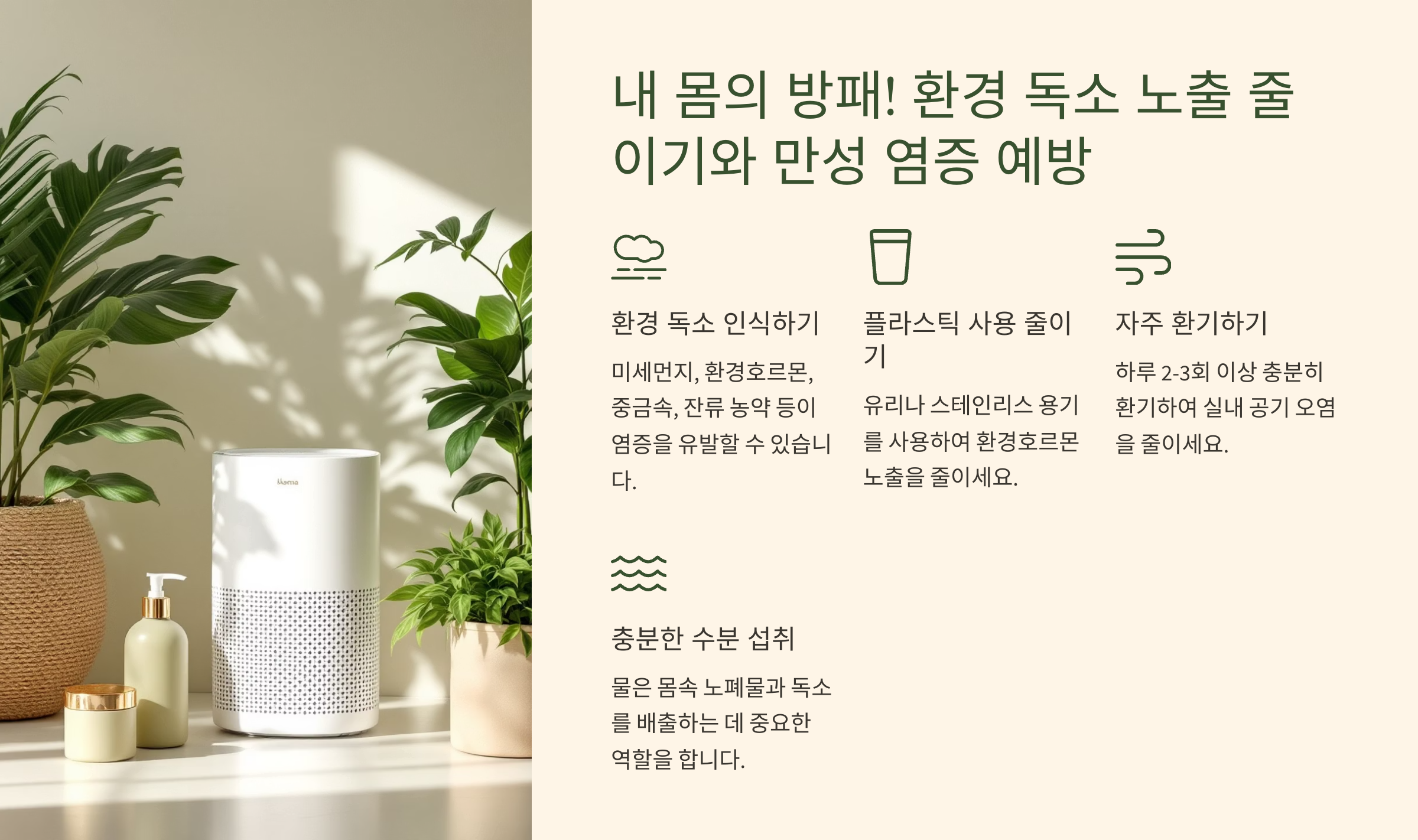 공기오염, 플라스틱, 독소 노출이 염증에 미치는 영향을 소개하고 예방 방법을 제안하는 생활 건강 이미지입니다.