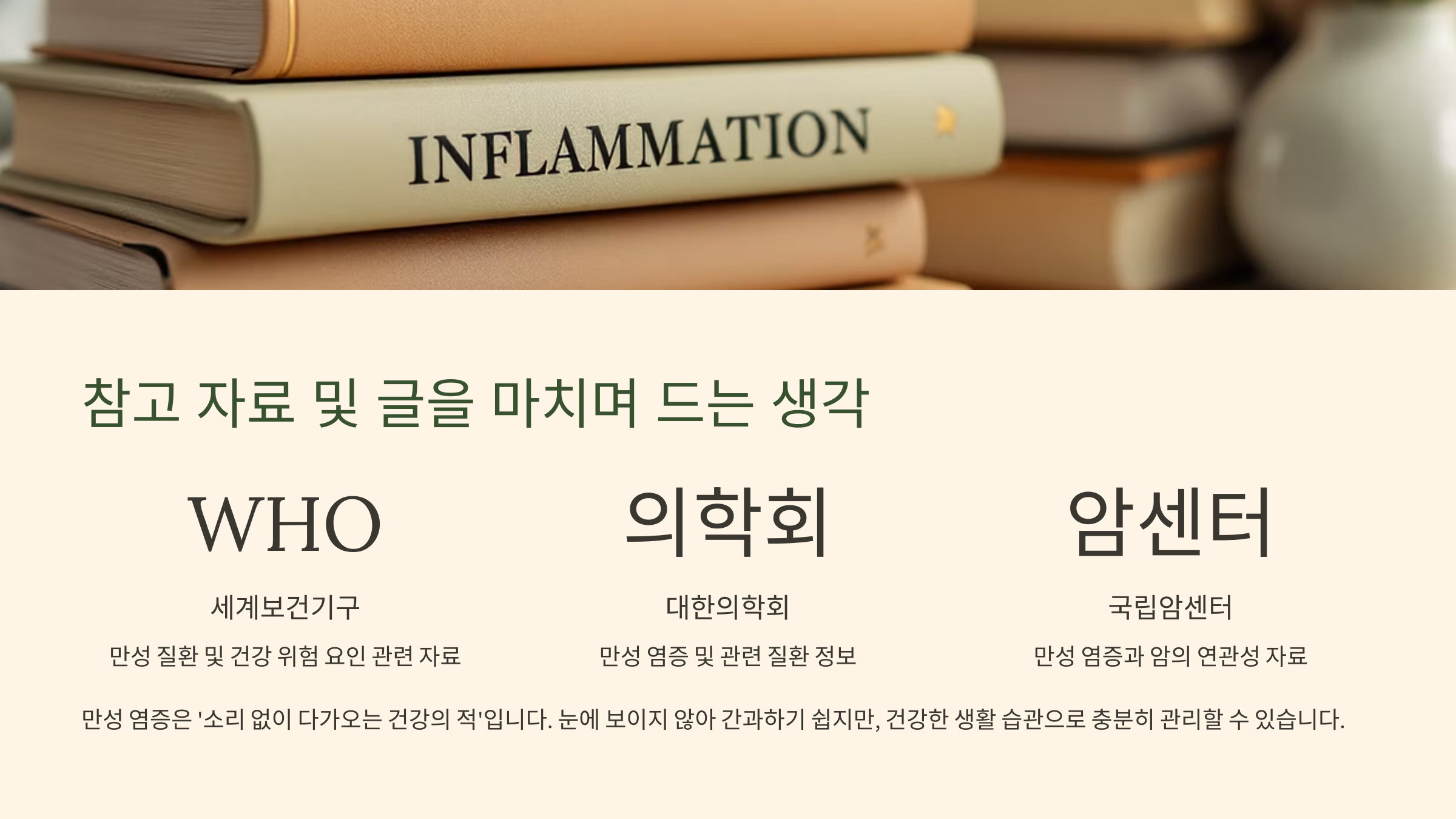 WHO, 대한의학회, 질병관리청 등 공신력 있는 기관들 역시 만성 염증 관리에서