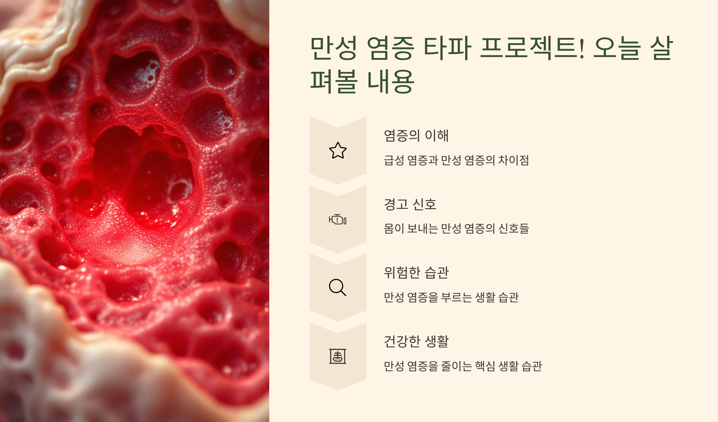 만성 염증의 이해부터 경고 신호, 위험한 습관, 건강한 생활까지 한눈에 정리한 콘텐츠 안내 이미지입니다.