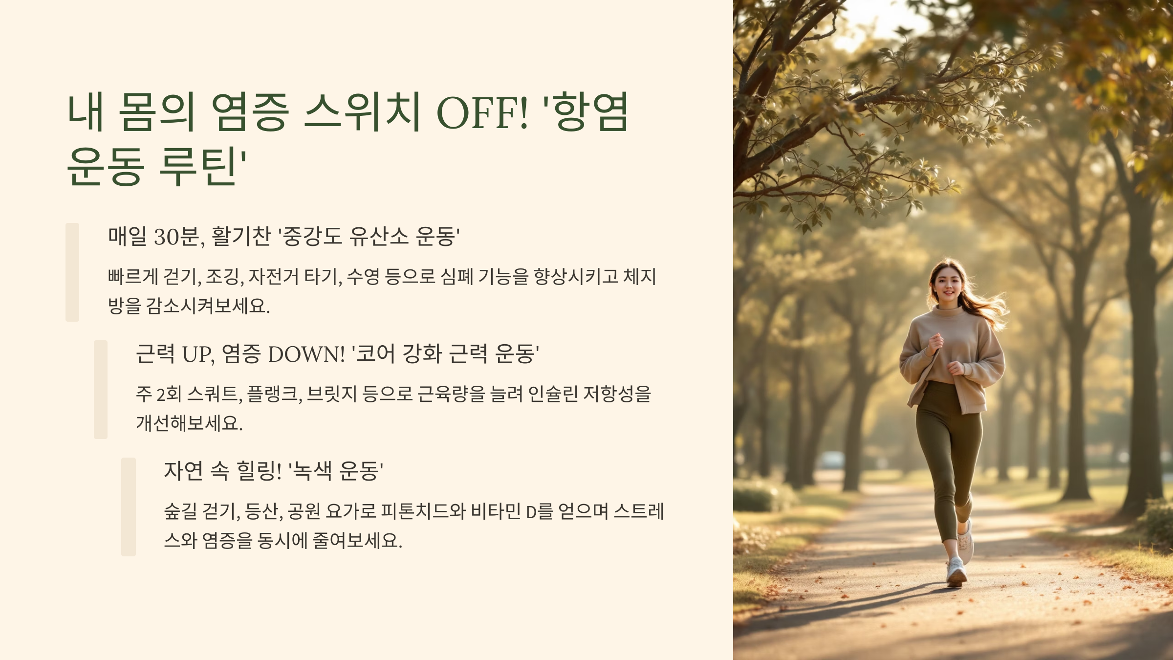 중강도 유산소 운동, 근력 운동, 자연 속 운동을 실천하는 항염 루틴 가이드를 담은 설명 이미지로, 실천적 가치를 부각시킵니다.