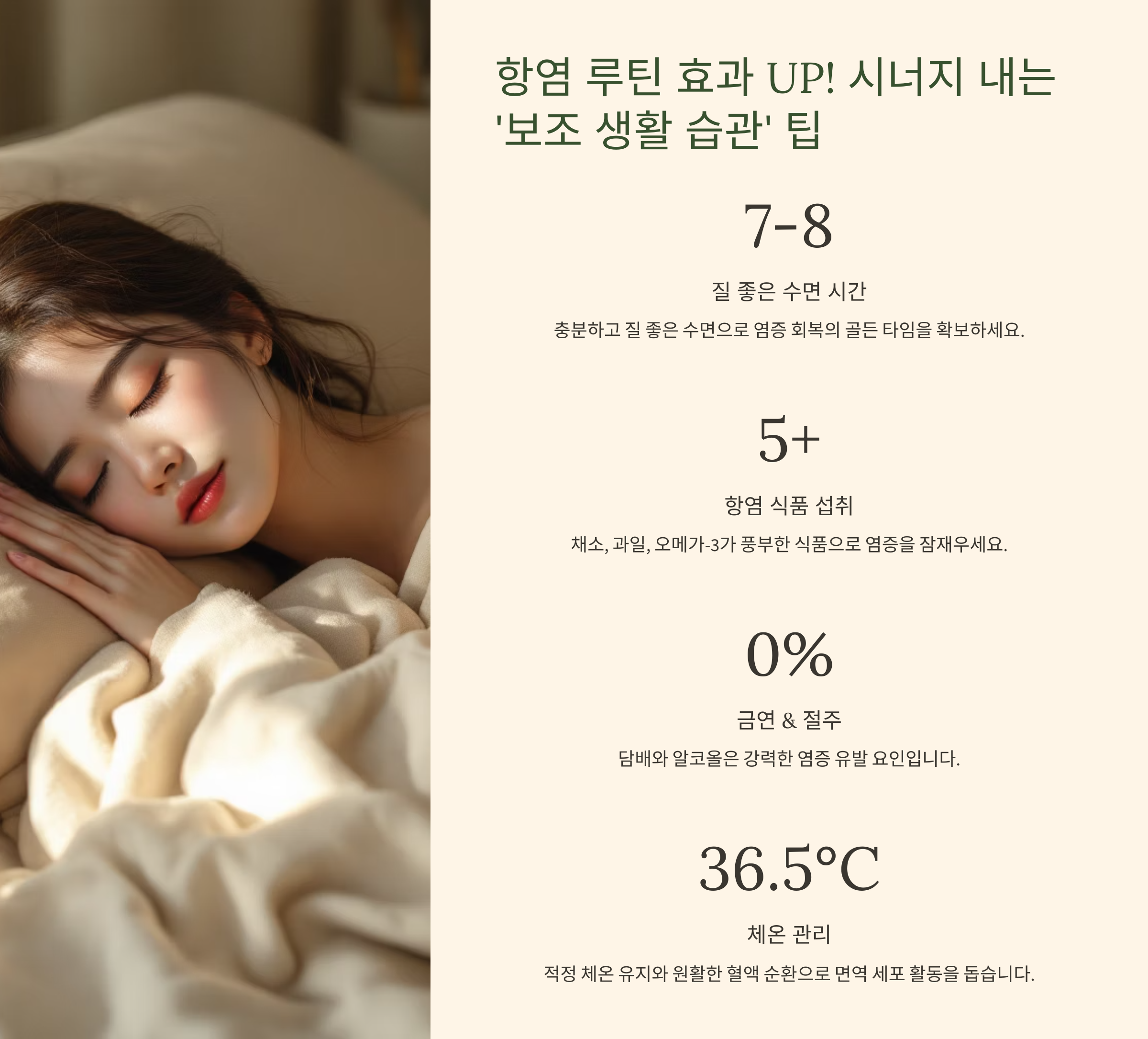 수면, 식단, 금연, 체온 유지 등 항염 루틴의 효과를 높이는 핵심 생활 습관을 제안하는 건강 정보 이미지입니다.