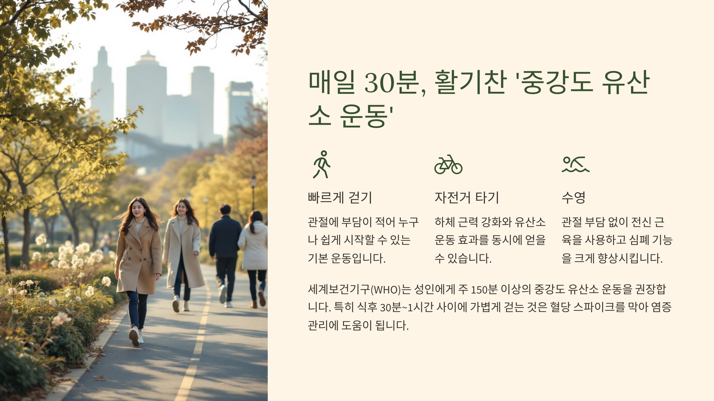 세계보건기구(WHO)는 성인에게 주 150분 이상의 중강도 유산소 운동을 권장합니다. 매일 30분씩 주 5회 실천하거나, 시간이 부족하다면 하루 10분씩 여러 번 나누어 하는 것도 좋습니다. 특히 식후 30분~1시간 사이에 가볍게 걷는 것은 혈당 스파이크를 막아 염증 관리에도 도움이 될 수 있어요!