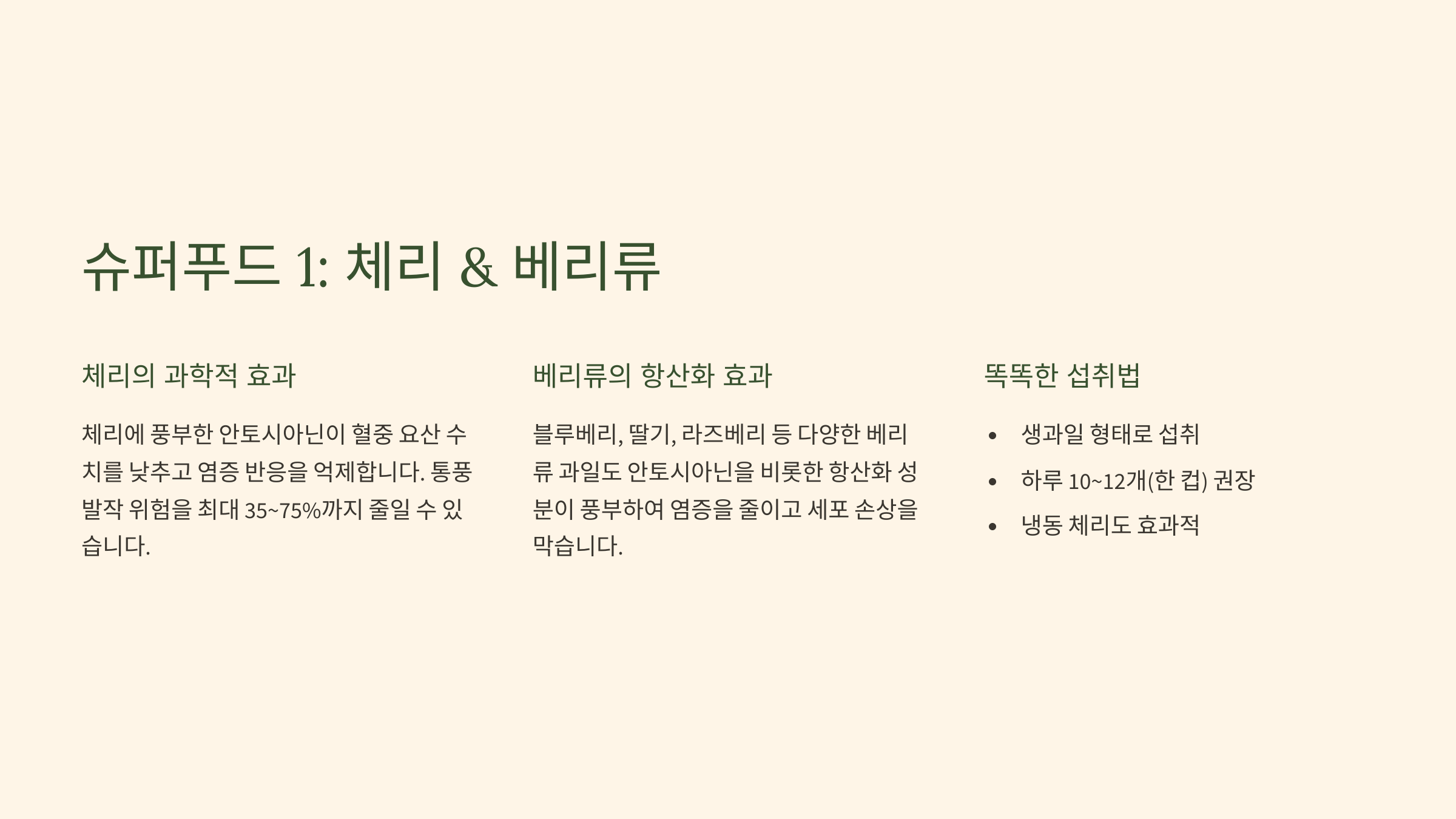 - (1) 슈퍼푸드 1: 체리 & 베리류 (안토시아닌의 강력한 항염 및 요산 저하 효과)