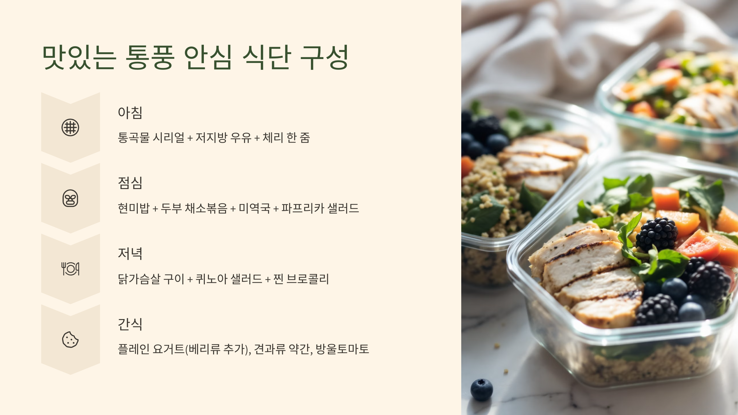 - (2) 아침 식단 아이디어: 오트밀 과일 요거트볼, 현미 채소죽, 두부 스크램블