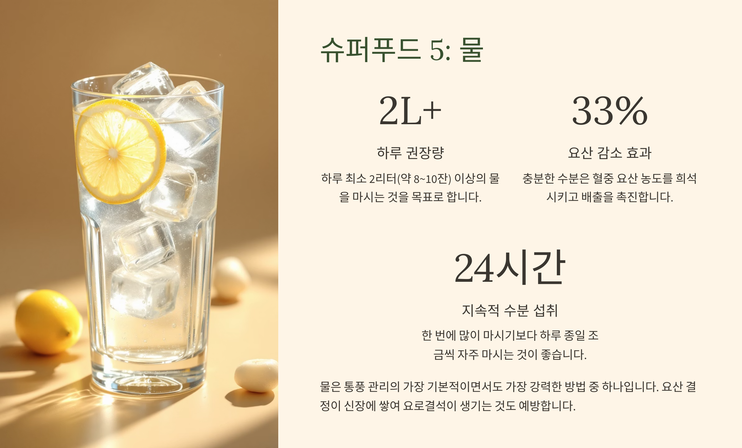 - (5) 슈퍼푸드 5: 물! (가장 기본적이지만 가장 강력한 요산 청소부)