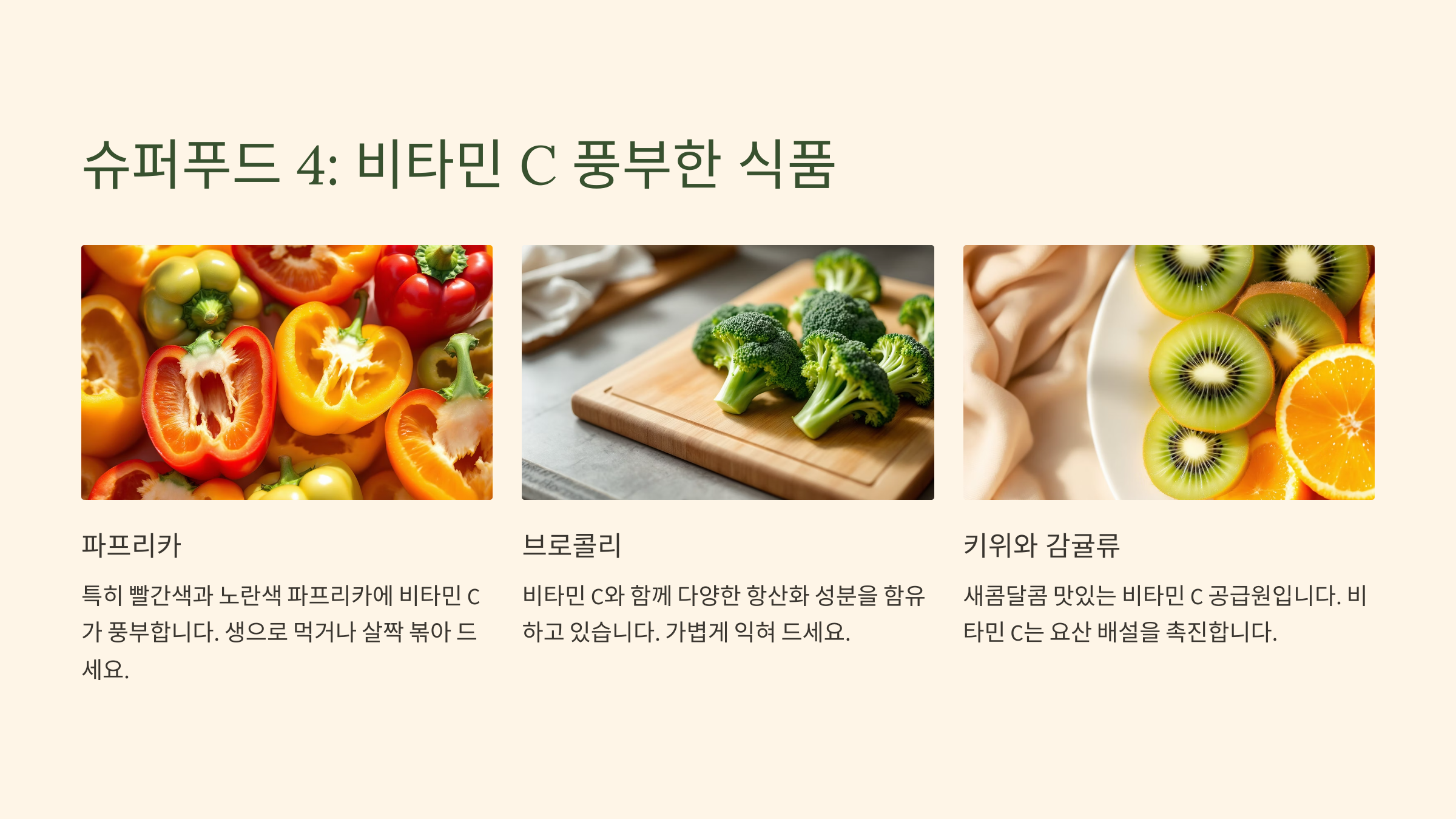 - 나. 비타민 C의 왕! 추천 채소 & 과일 리스트 (파프리카, 브로콜리, 키위, 감귤류 등)