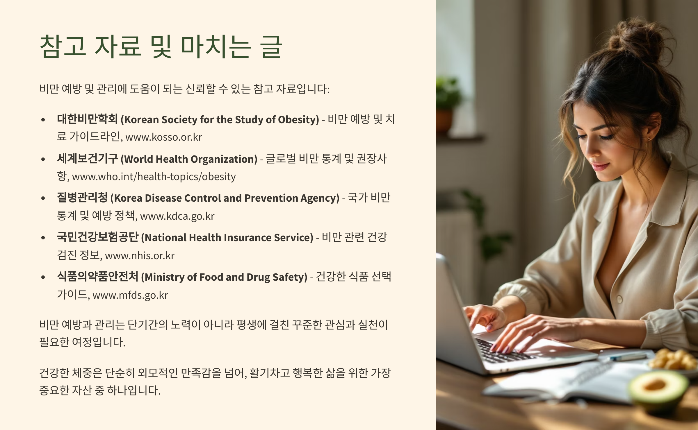 - 질병관리청 국가건강정보포털 (health.kdca.go.kr): 비만 원인, 증상, 예방, 관리 등 일반인을 위한 신뢰도 높은 건강 정보.