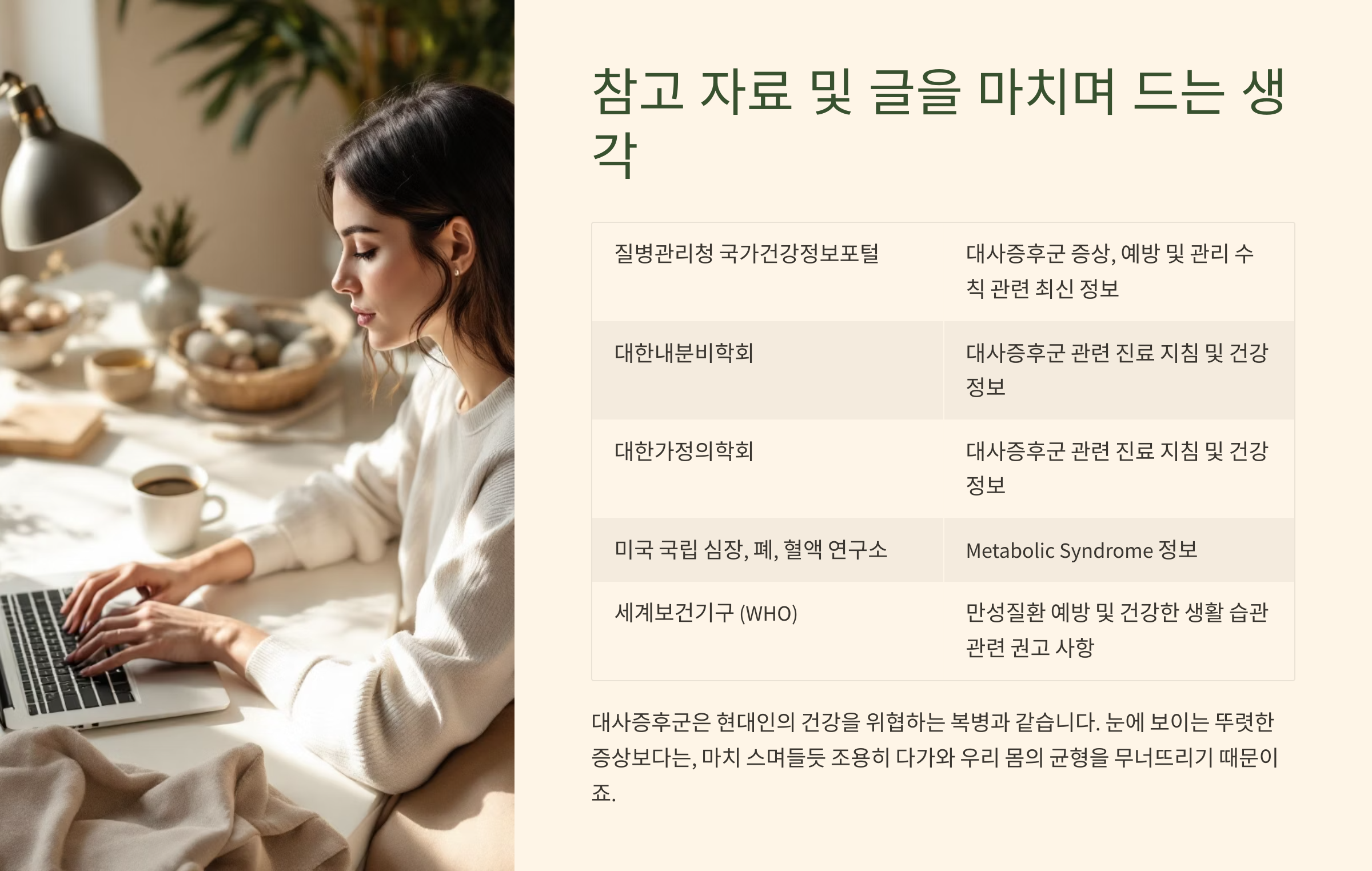 대사증후군은 현대인의 건강을 위협하는 복병과 같다는 생각이 듭니다. 눈에 보이는 뚜렷한 증상보다는, 마치 스며들듯 조용히 다가와 우리 몸의 균형을 무너뜨리기 때문이죠. 하지만 오늘 함께 살펴본 것처럼, 우리 몸이 보내는 작은 신호들에 귀 기울이고, 건강한 생활 루틴을 꾸준히 실천한다면 충분히 이겨낼 수 있는 상대이기도 합니다. 이 글을 통해 많은 독자분들이 대사증후군에 대한 경각심을 갖고, 건강한 내일을 위한 작은 실천을 시작하는 계기가 되었으면 하는 바람입니다. 핼시노트는 여러분의 건강한 변화를 항상 응원합니다!