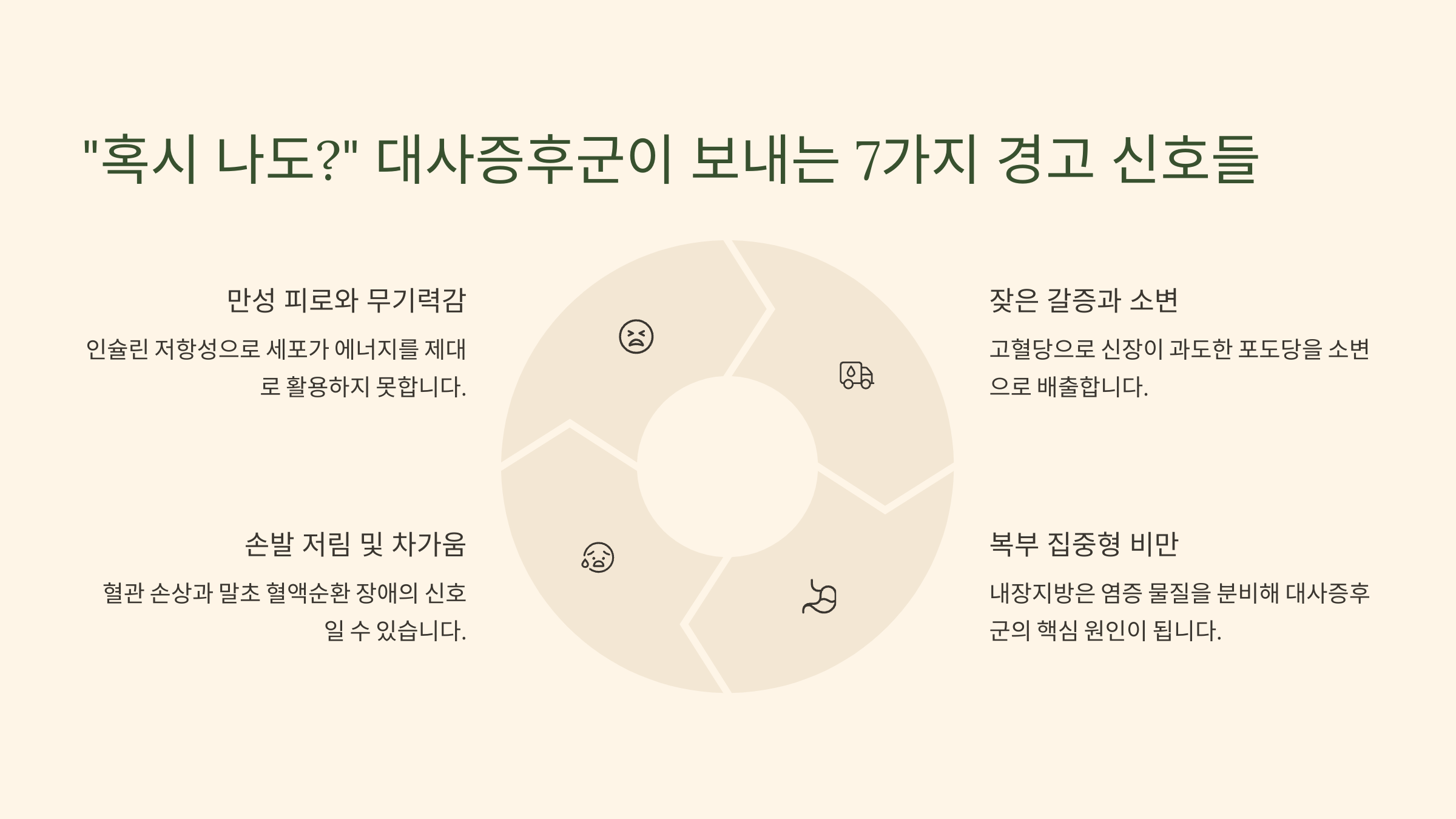 - (1) 만성 피로와 무기력감: "잠을 자도 피곤하다면? 에너지 대사의 적신호!" (인슐린 저항성과 세포 에너지 공급 문제 심층 이해)