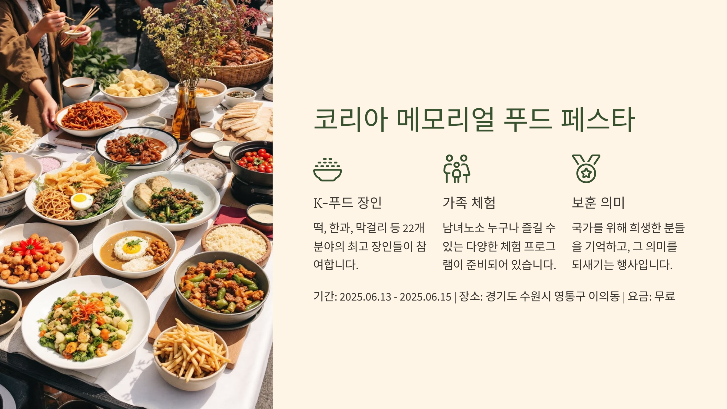 보훈과 음식문화가 만나는 뜻깊은 종합문화축제, '코리아 메모리얼 푸드 페스타'가 경기도청에서 개최됩니다. 국가를 위해 희생한 분들을 기억하고, 그 의미를 되새기는 동시에 다양한 음식 문화를 체험할 수 있는 행사입니다. 떡, 한과, 막걸리 등 K-푸드 22개 분야의 최고 장인들이 참여하여 눈과 입이 즐거운 경험을 선사합니다. 남녀노소 누구나 즐길 수 있는 다양한 체험 프로그램이 준비되어 있어 가족 나들이로도 안성맞춤입니다.