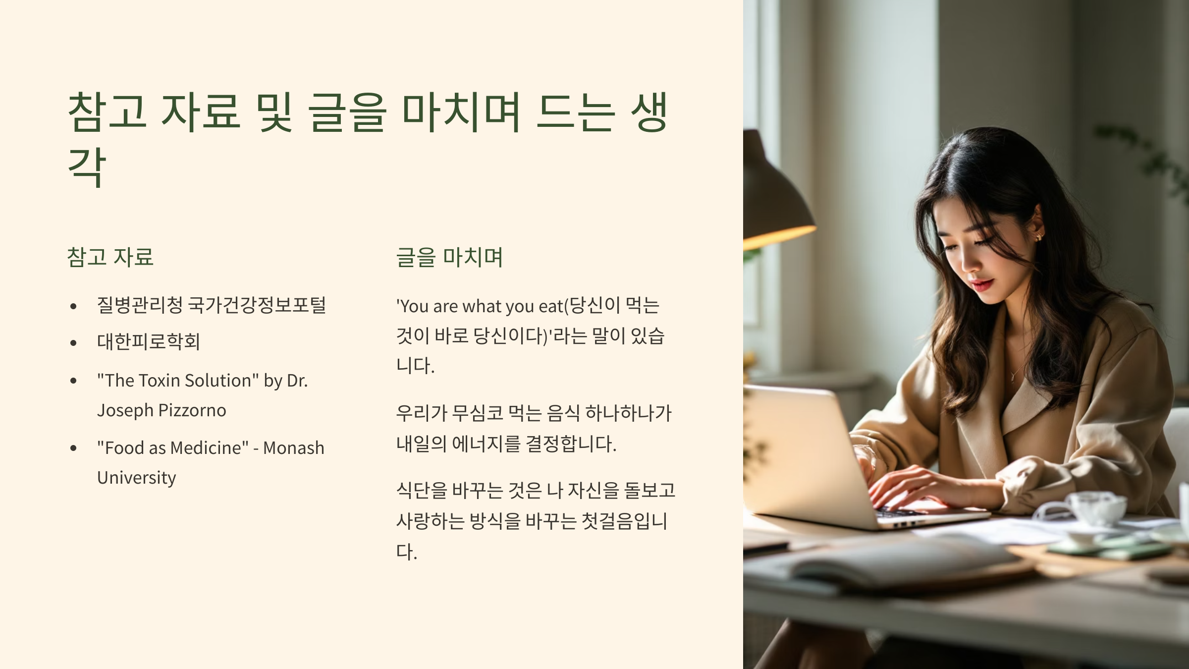 'You are what you eat(당신이 먹는 것이 바로 당신이다)'라는 말이 있습니다. 만성 피로에 대한 이번 글을 준비하며 이 말이 그 어느 때보다 절실하게 다가왔습니다. 우리가 무심코 먹는 음식 하나하나가 내일의 에너지를 결정한다는 사실을 기억하고, 조금 귀찮더라도 내 몸을 위한 건강한 식탁을 차리는 노력이 결국 가장 확실한 피로 회복제라는 생각이 듭니다. 식단을 바꾸는 것은 단순히 음식을 바꾸는 것을 넘어, 나 자신을 돌보고 사랑하는 방식을 바꾸는 첫걸음일 것입니다.