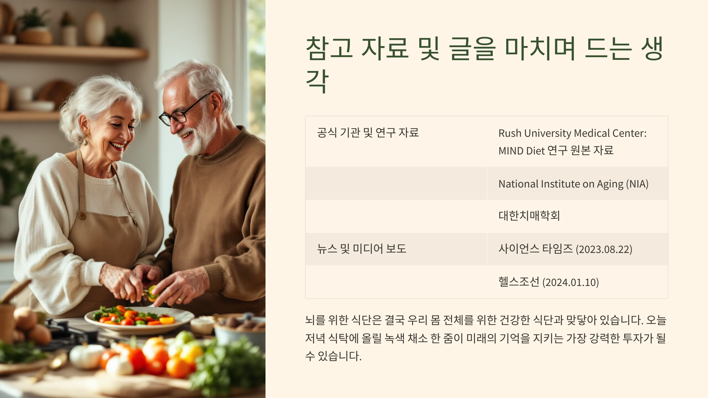 이 글이 "무엇을 먹어야 할지 모르겠다"는 막막함을 넘어, "이렇게 먹으면 내 뇌를 지킬 수 있구나"라는 희망과 구체적인 실천 계획을 선물했기를 바랍니다. 당신의 현명한 선택이 당신의 빛나는 기억을 지켜줄 것입니다.