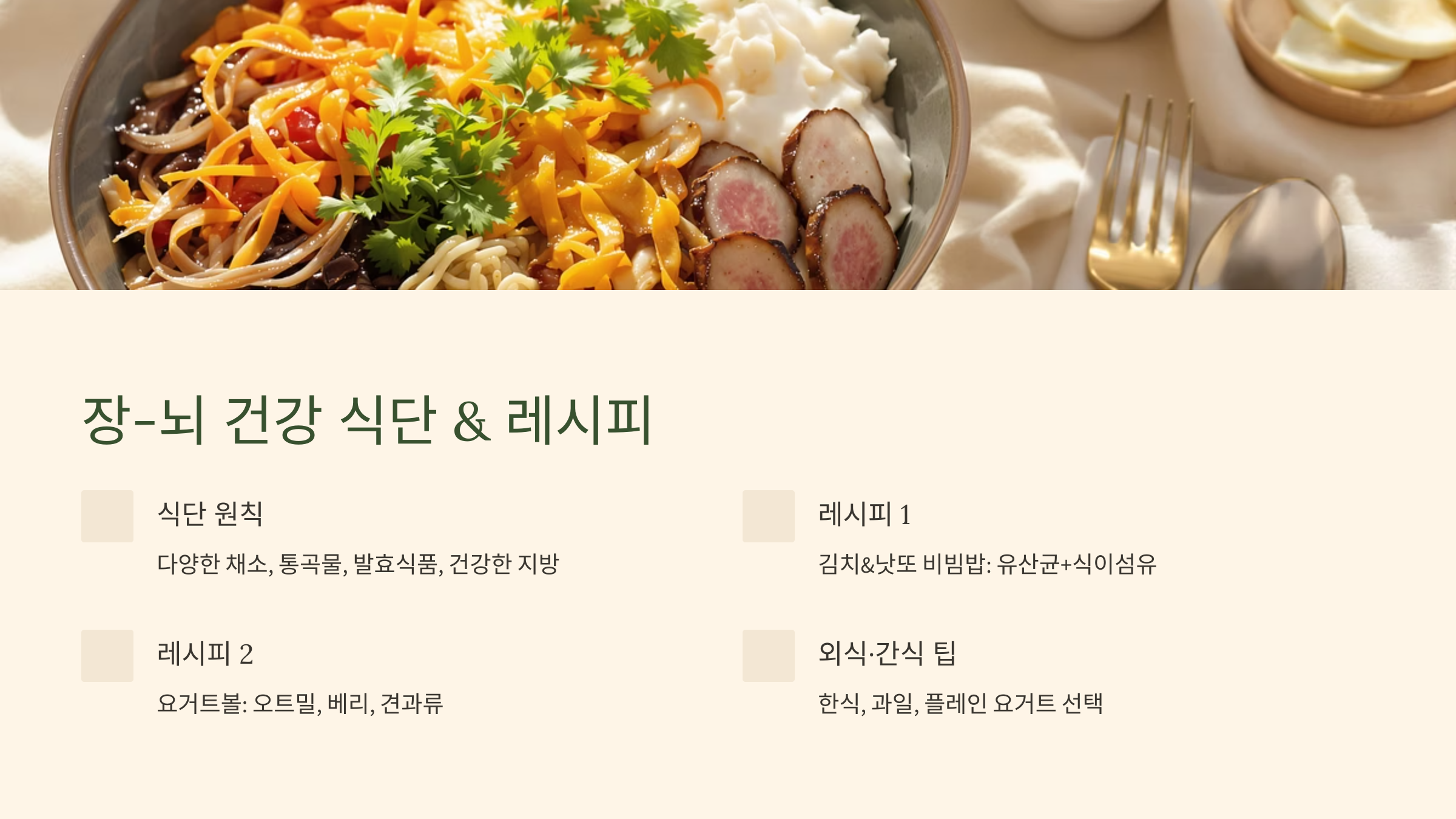 - 맛있게 즐기는 '장-뇌 건강 식단' & 주간 식단 구성 가이드 🥣