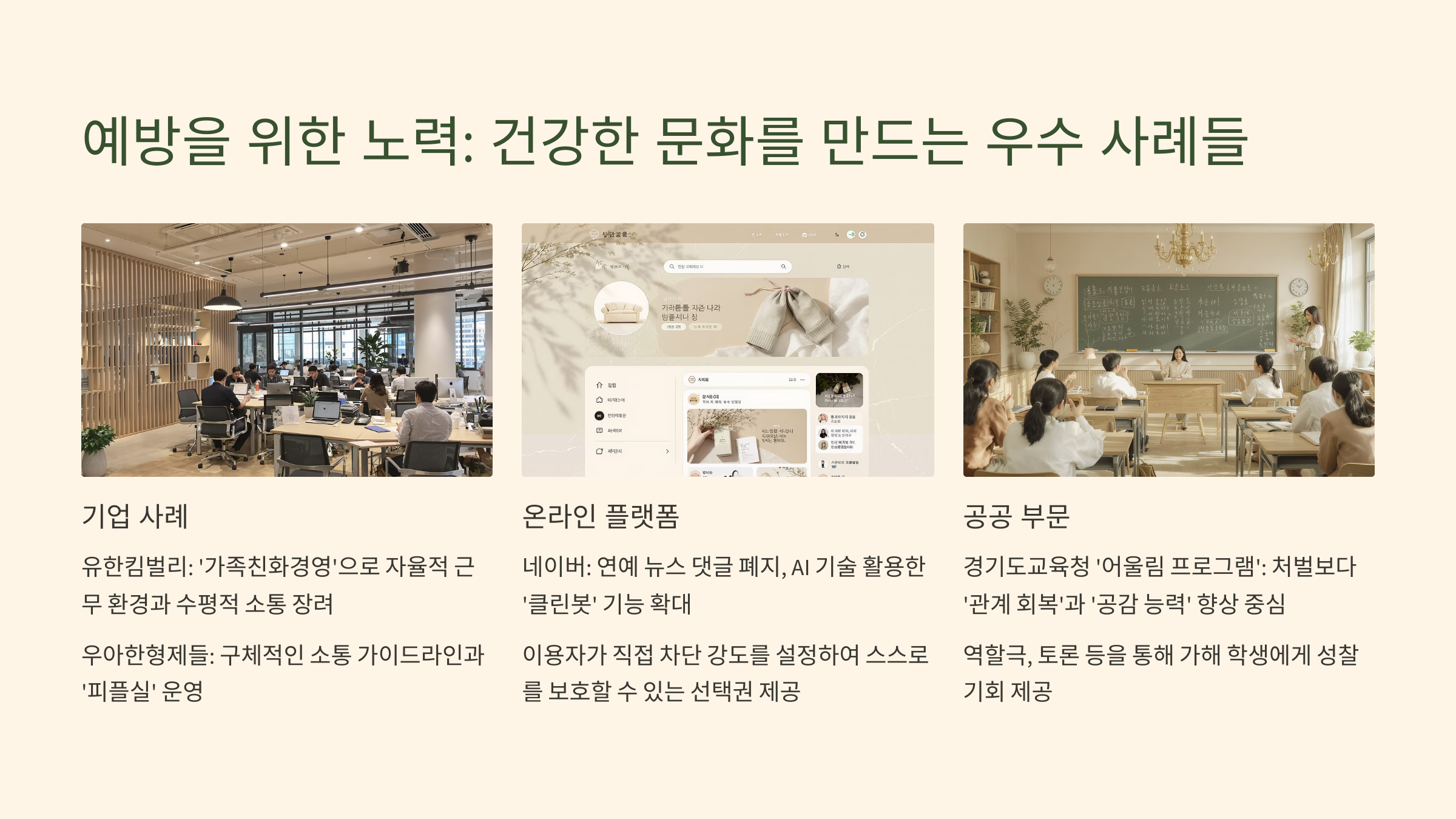 기업, 온라인 플랫폼, 공공 부문에서 실천 중인 괴롭힘 예방과 건강한 소통 문화 조성 사례를 소개하는 이미지입니다.