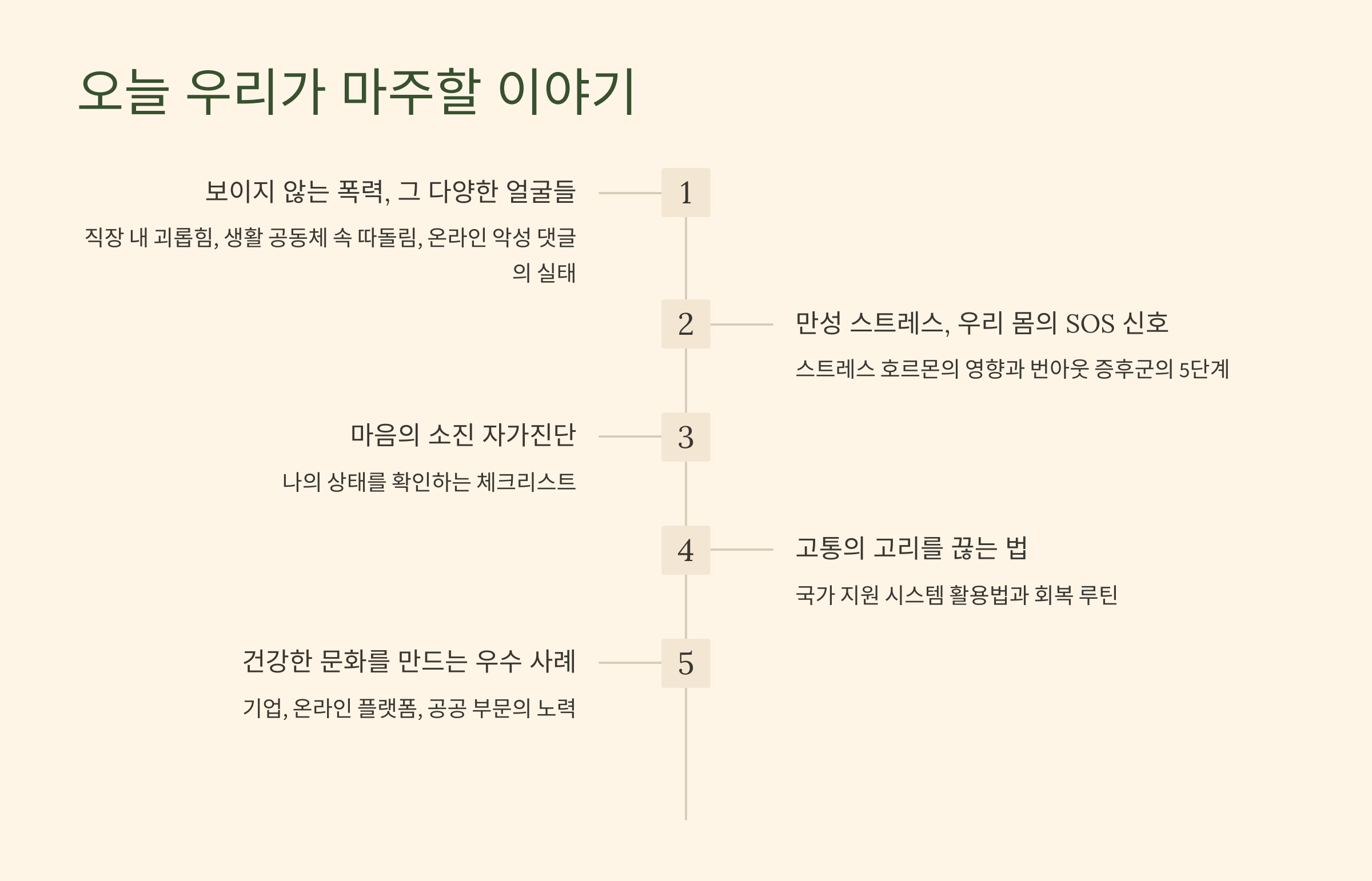 사회적 폭력, 스트레스, 심리적 자가진단, 회복 루틴 등 현대인이 꼭 알아야 할 건강과 심리주제 핵심 콘텐츠를 한눈에 정리한 목차 안내 이미지입니다.