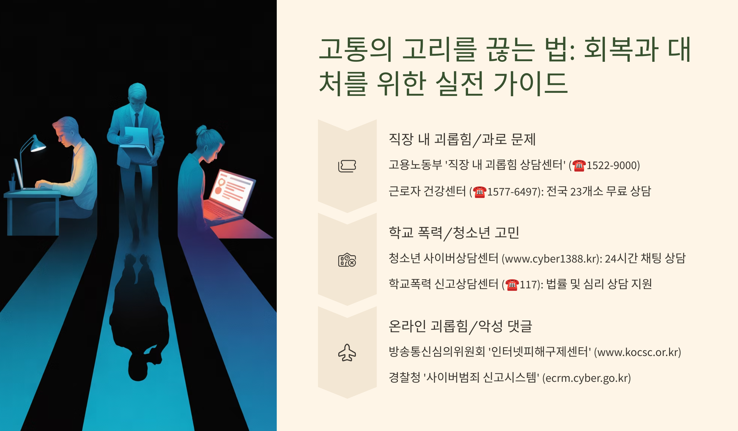 직장, 학교, 온라인에서의 고통을 벗어나기 위한 회복·대처법과 도움받을 수 있는 실질적인 지원 정보를 한눈에 보여주는 가이드 이미지입니다.
