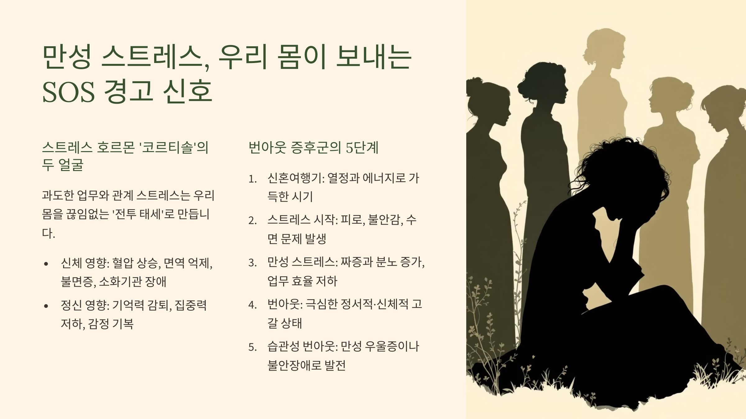 - 3단계 (만성 스트레스): 스트레스가 일상화되어 피로감이 극심해지고, 짜증과 분노가 잦아지며 업무 효율이 뚜렷하게 떨어집니다.