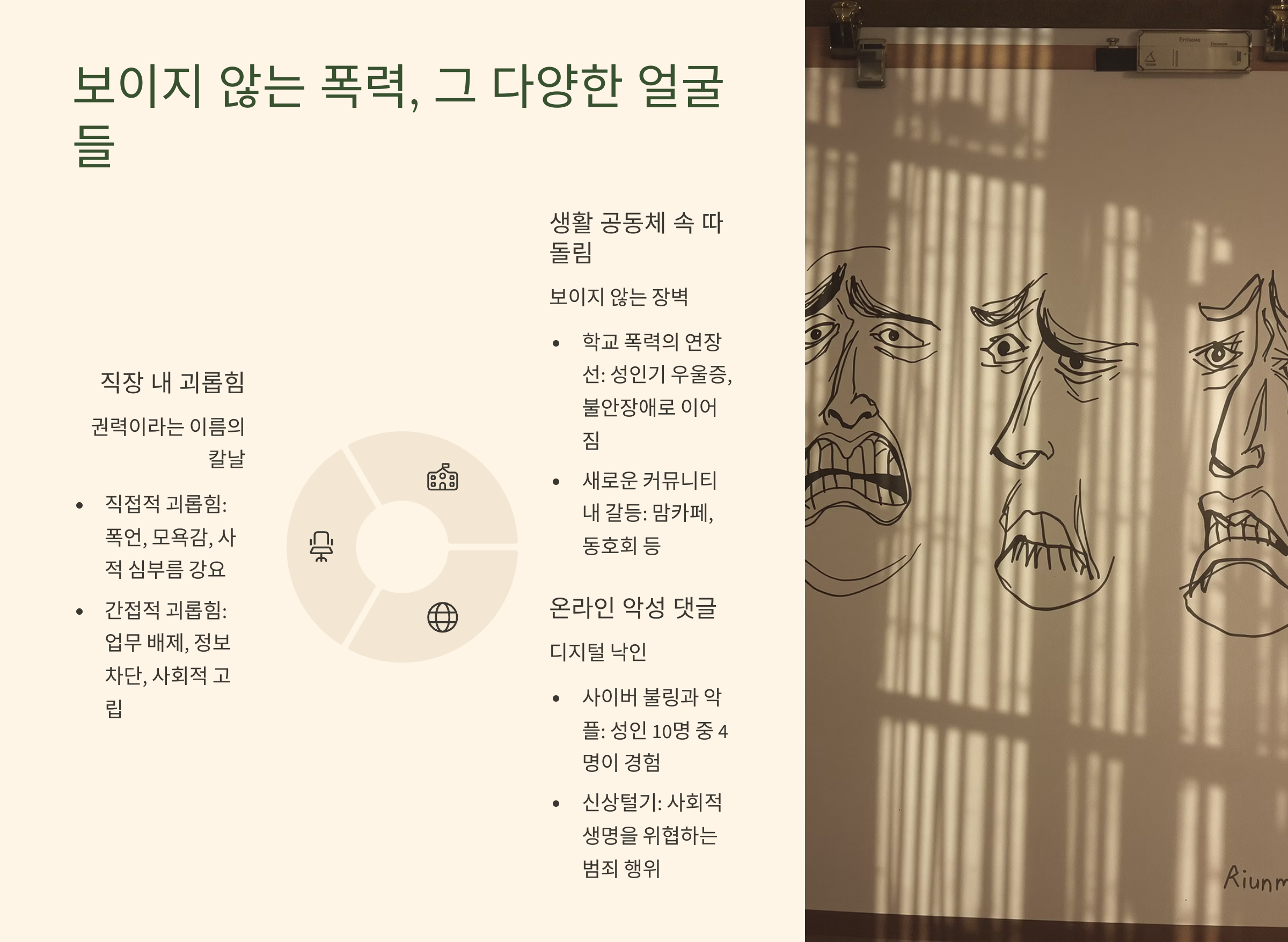 괴롭힘은 멍과 상처를 남기는 물리적 폭력만을 의미하지 않습니다. 때로는 차가운 무시, 비난이 섞인 농담, 의도적인 소외와 같이 형체 없는 칼날이 되어 우리의 자존감을 베어내고, 영혼을 서서히 멍들게 합니다. 눈에 보이지 않기에 '내가 예민한가?'라는 자책감에 빠지게 만들고, 주변에 도움을 청하기도 어려운 이 은밀한 폭력은, 결국 우리 몸과 마음에 뚜렷한 질병의 흔적을 남깁니다. 지금부터 우리 삶의 가장 가까운 공간인 직장과 학교, 그리고 온라인에서 괴롭힘이 어떤 다양한 얼굴로 우리를 위협하는지 구체적인 사례와 함께 깊이 있게 살펴보겠습니다.