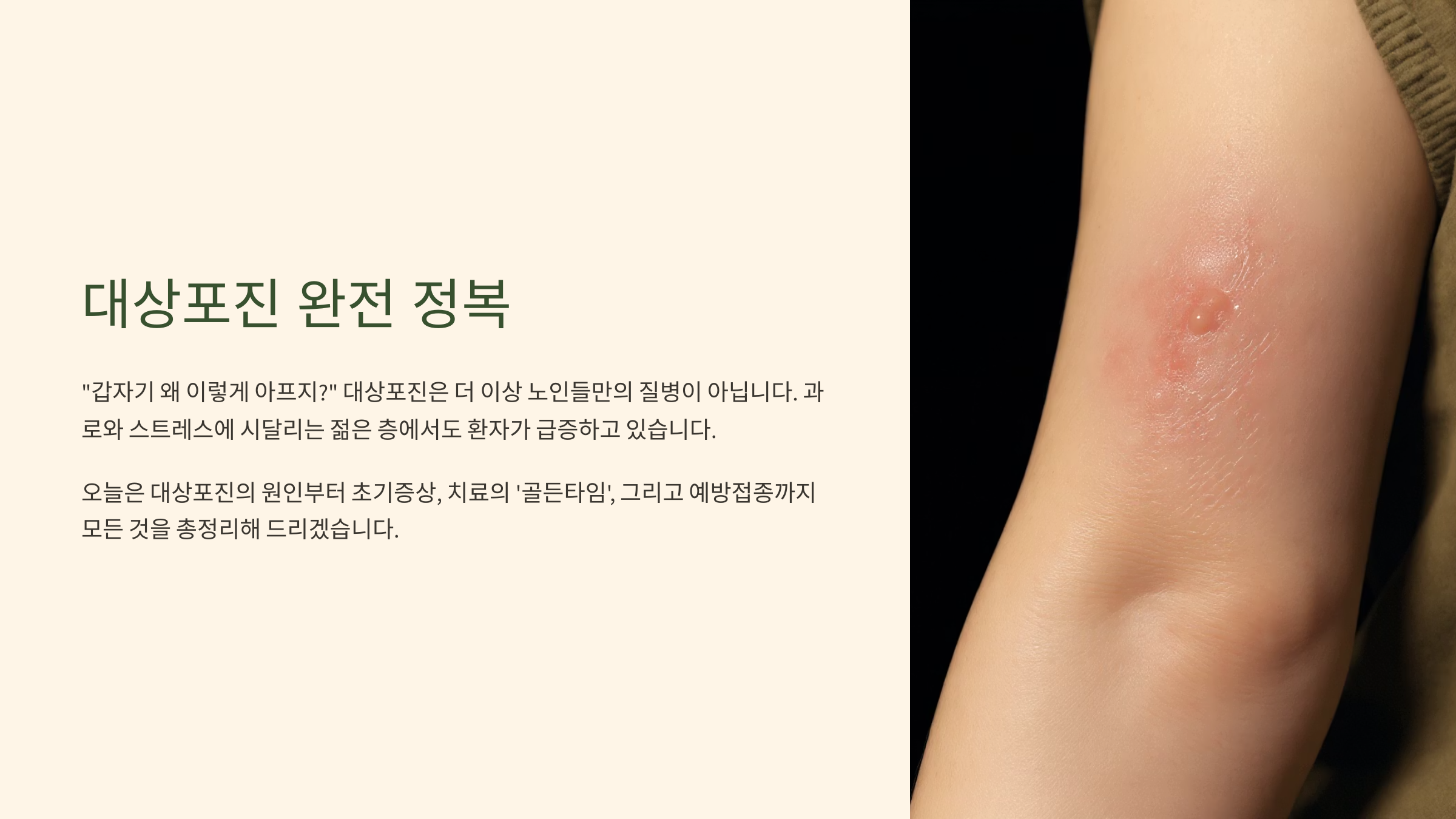 "몸의 한쪽으로 띠 모양의 붉은 발진과 물집이 생기고, 바늘로 콕콕 쑤시거나 칼로 베는 듯한 극심한 통증이 나타난다." 바로 '대상포진'의 대표적인 증상입니다. 이름만 들어도 두려운 이 질병, 과연 나이가 많은 분들에게만 해당하는 이야기일까요?