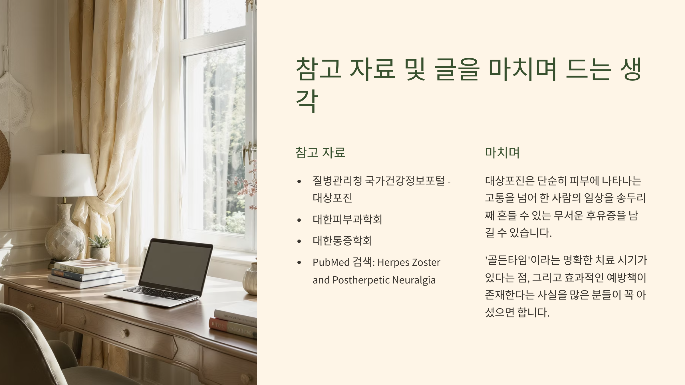 대상포진에 대해 깊이 알아보면서, 이 질병이 단순히 피부에 나타나는 고통을 넘어 한 사람의 일상을 송두리째 흔들 수 있는 무서운 후유증을 남길 수 있다는 점을 다시 한번 깨닫게 되었습니다. 특히 '골든타임'이라는 명확한 치료 시기가 있다는 점, 그리고 효과적인 예방책이 존재한다는 사실을 많은 분들이 꼭 아셨으면 하는 바람입니다.