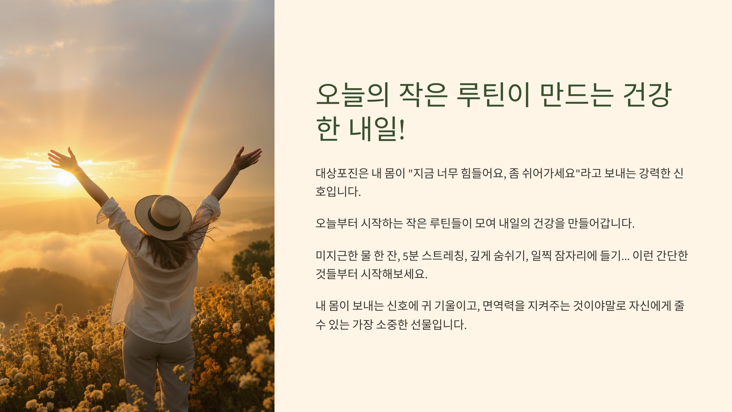 오늘부터 시작하는 작은 루틴들이 모여 내일의 건강을 만들어갑니다. 미지근한 물 한 잔 마시기, 5분 스트레칭하기, 깊게 숨쉬기, 일찍 잠자리에 들기... 이런 간단한 것들부터 시작해보세요.