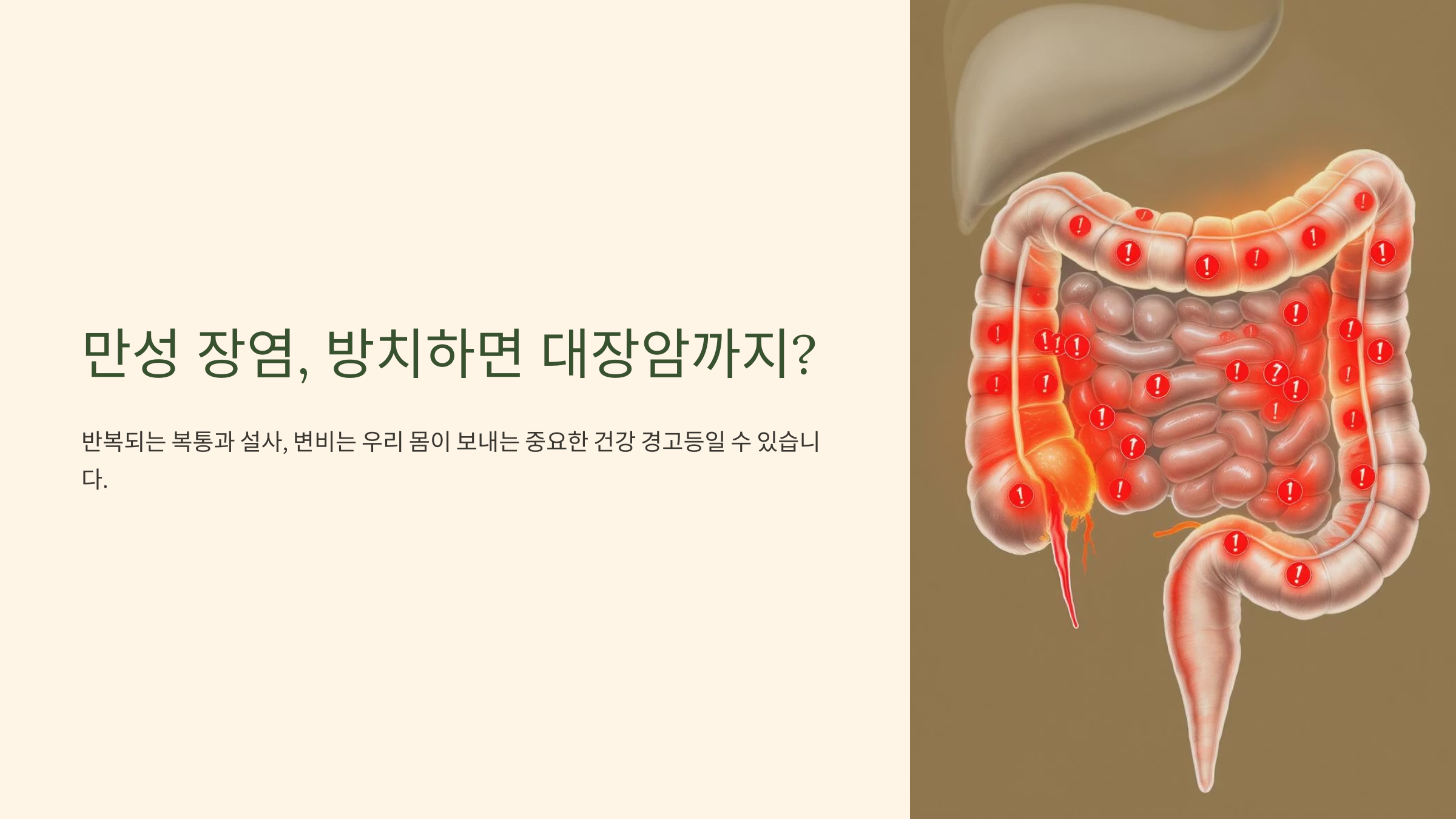 혹시 이런 증상, '원래 장이 좀 예민해서 그래'라며 대수롭지 않게 넘기고 계신가요? 😥 하지만 반복되는 복통과 설사, 변비는 우리 몸, 특히 '장'이 보내는 중요한 건강 경고등일 수 있습니다. 많은 분들이 '만성 장염'이라는 말을 흔히 사용하지만, 이 안에는 단순 기능성 질환부터 대장암의 씨앗이 될 수 있는 무서운 염증성 질환까지 포함되어 있다는 사실, 알고 계셨나요?