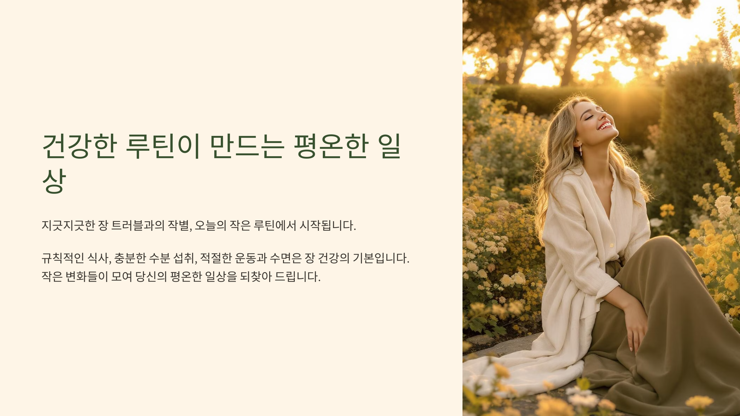 오늘 '건강 루틴' 편에서는 지긋지긋한 장 트러블에서 벗어나 편안한 하루를 만들기 위해, 스트레스 관리부터 운동, 수면까지 **일상에서 바로 실천할 수 있는 구체적인 행동 지침**들을 A to Z로 알려드릴게요. 더 이상 증상에 끌려다니지 말고, 오늘부터 건강한 루틴의 주인이 되어보세요! ✨