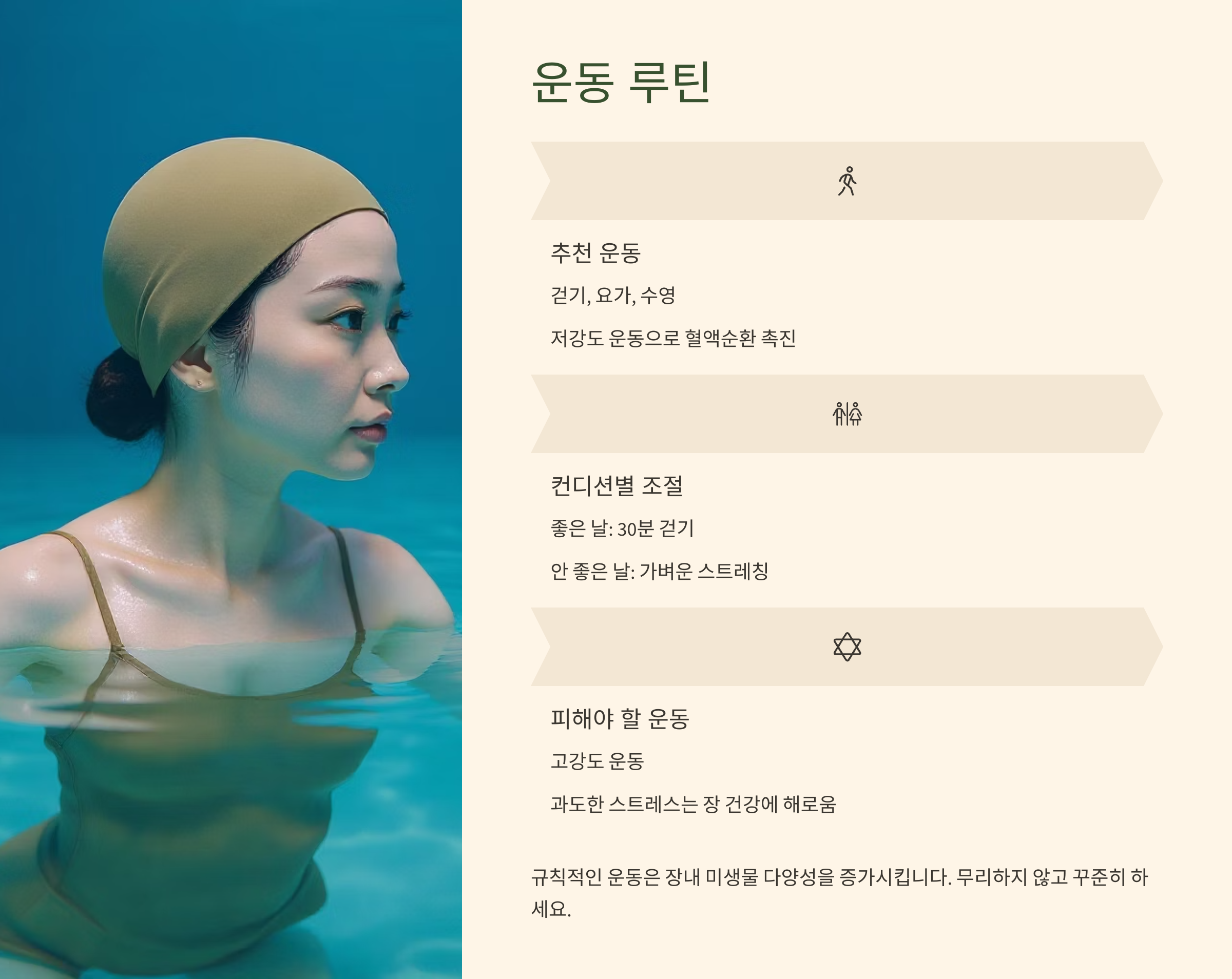 매일 같은 운동을 고집하기보다, 그날의 장 컨디션에 따라 유연하게 조절하는 것이 중요합니다.