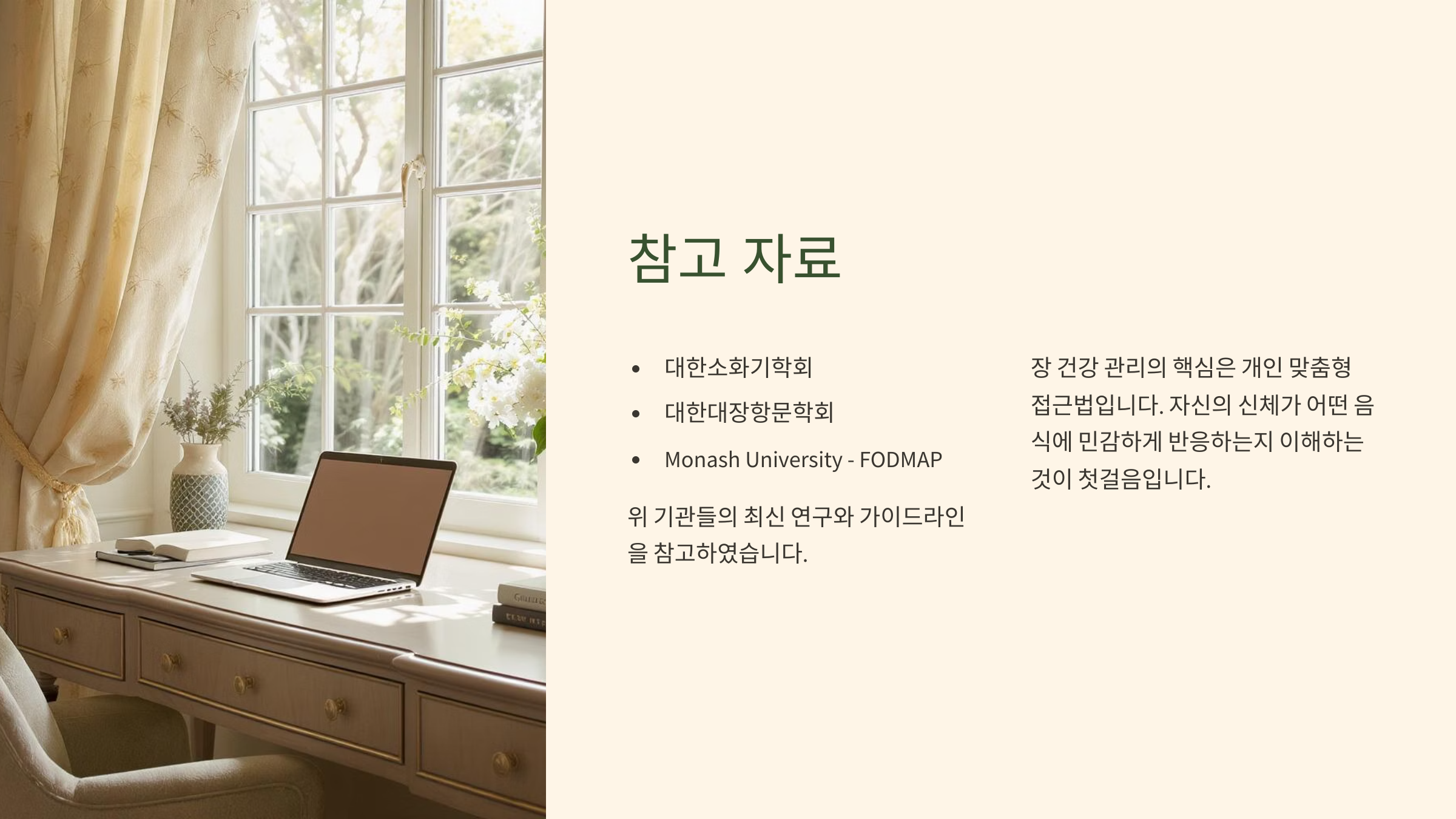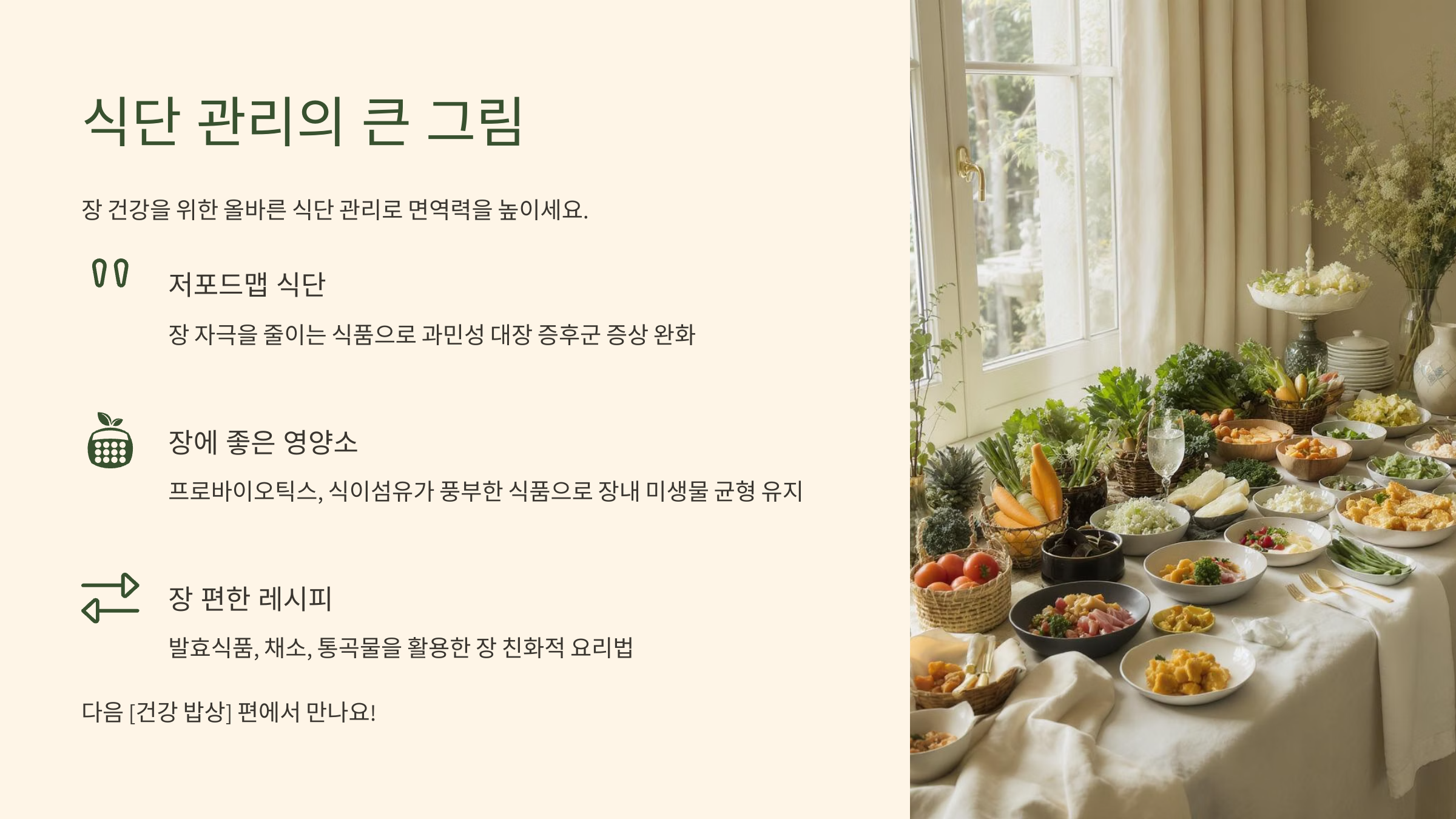 그래서 닥터리 건강TV에서는 다음 **[건강 식단]** 편을 통해, 만성 장염 환자를 위한 **'저포드맵(Low-FODMAP) 식단'의 구체적인 실천 방법, 장에 좋은 영양소와 추천 식품, 그리고 따라 하기 쉬운 '장 편한 레시피'**까지 훨씬 더 깊이 있고 상세하게 다룰 예정입니다. 이번 [건강 루틴] 편에서는 식단 외에 우리가 꼭 실천해야 할 다른 중요한 습관들에 집중해 보겠습니다. 다음 글도 많이 기대해주세요!