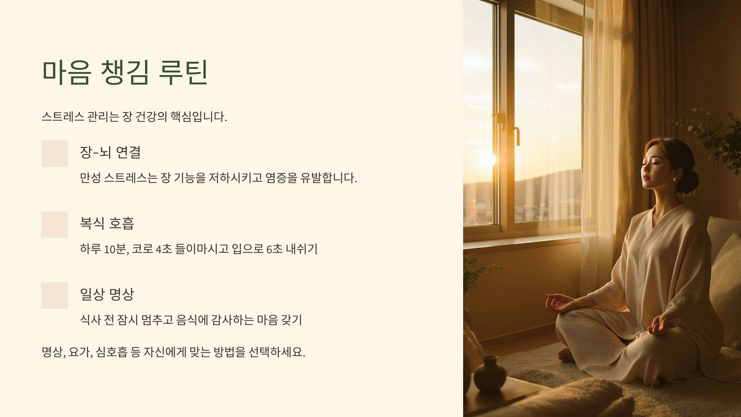 만성 장염 환자들은 '스트레스 받으면 바로 신호가 온다'고 말합니다. 그만큼 장과 마음은 긴밀하게 연결되어 있습니다. 스트레스를 관리하는 것은 장을 관리하는 것과 같습니다.