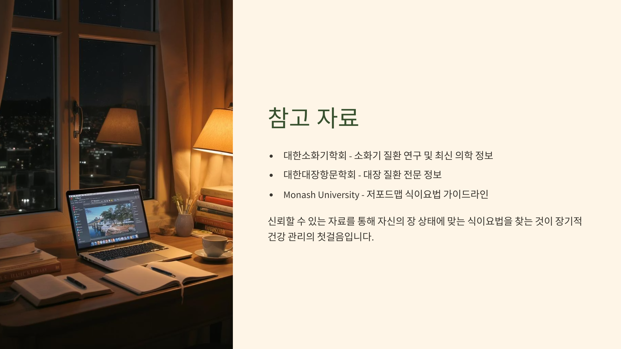 이번 '건강 식단' 편을 준비하며, '무엇을 먹는가'의 문제가 우리의 신체적, 정신적 건강에 얼마나 지대한 영향을 미치는지 다시 한번 절감했습니다. 특히 만성 장염처럼 매일의 식사가 증상과 직결되는 질환의 경우, 올바른 식단 정보는 그 어떤 값비싼 보약보다 소중한 '처방전'이 될 수 있다는 생각이 들었습니다. 부디 이 글이 매일 식탁 앞에서 고민하는 많은 분들께 실질적인 도움이 되고, '먹는 즐거움'과 '편안한 하루'를 되찾는 작은 계기가 되기를 바랍니다.