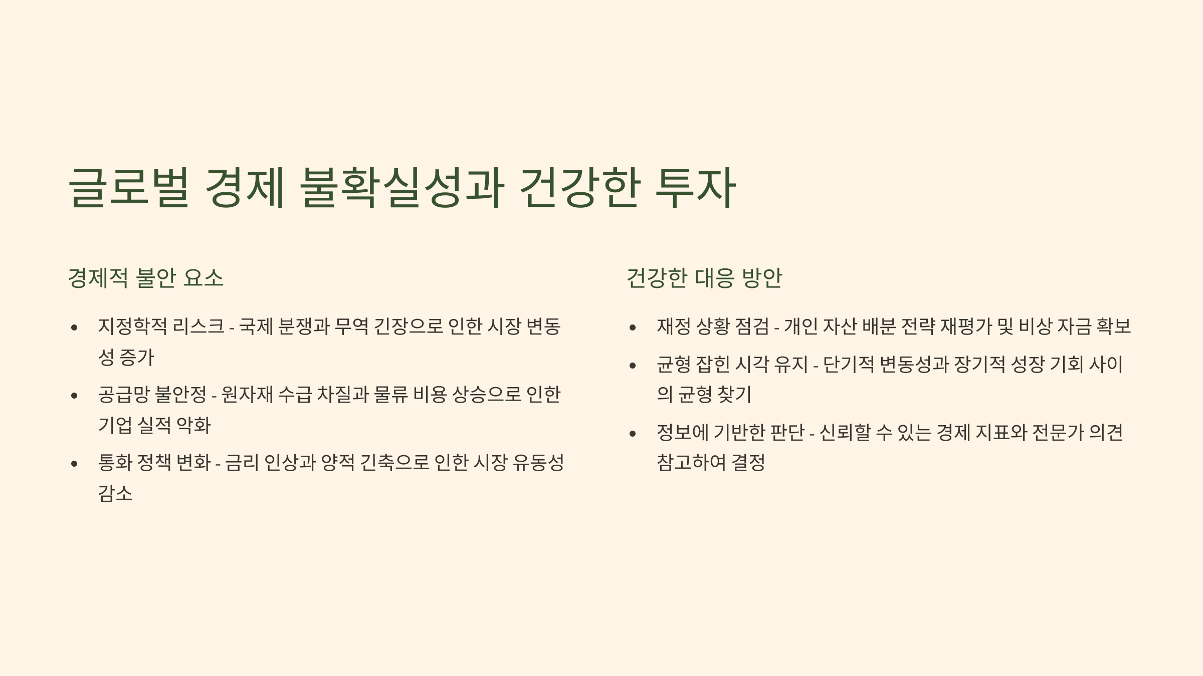 글로벌 경제 상황은 국내 경제뿐만 아니라 우리 개인의 삶과 재정 건강에도 영향을 미칩니다. 경제적 불확실성은 투자 심리를 위축시키고 불안감을 유발할 수 있습니다. 이러한 글로벌 흐름을 이해하고 자신의 재정 상황을 점검하는 것은 스트레스를 관리하고 건강한 경제 생활을 유지하는 데 중요합니다. 정보에 기반한 현명한 판단과 균형 잡힌 시각으로 경제적 불안감을 극복하는 지혜가 필요합니다.