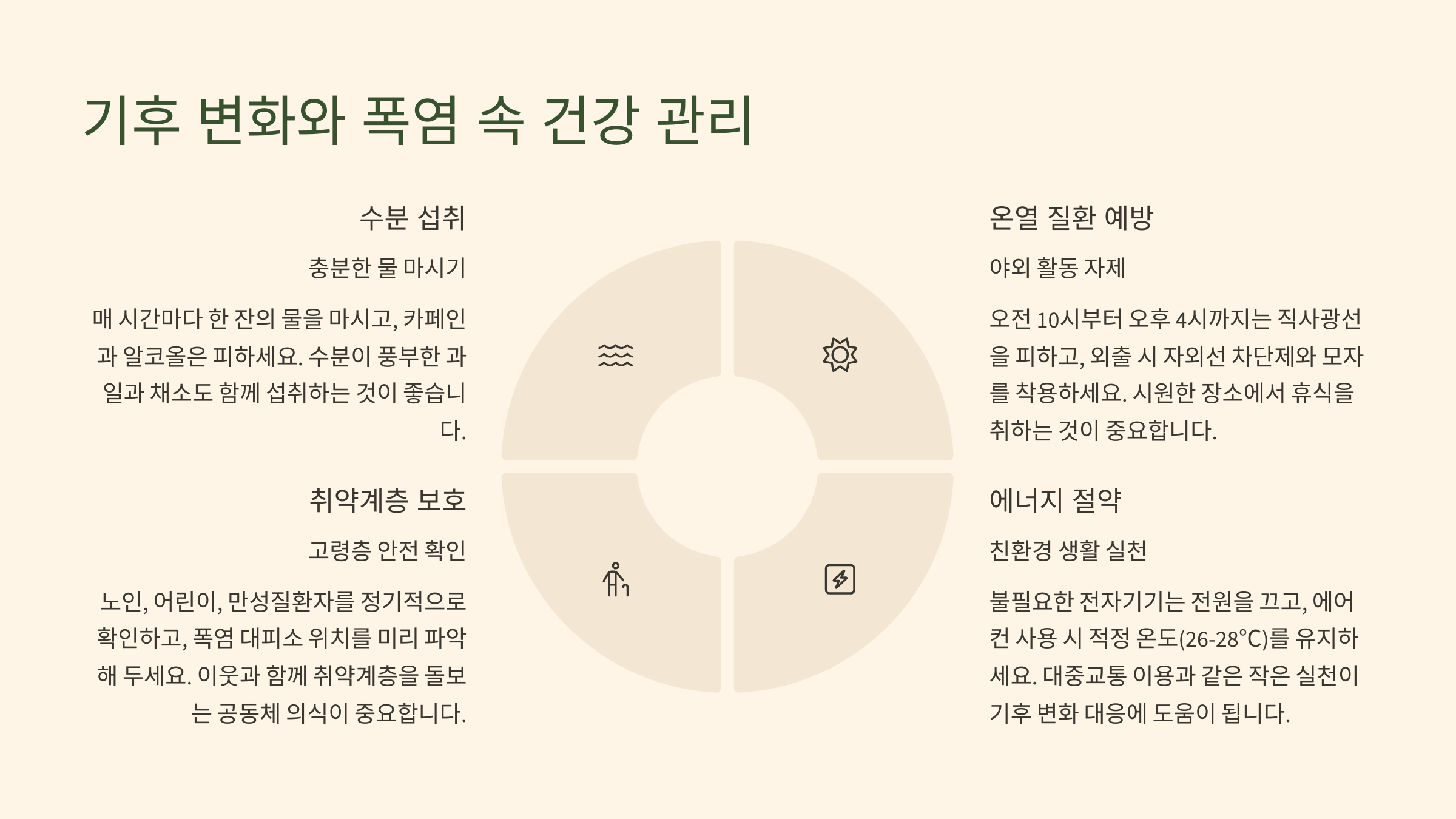 폭염은 건강에 치명적인 영향을 미칠 수 있으며, 특히 고령층과 야외 근로자들에게는 더욱 위험합니다. 기후 변화는 장기적으로 우리의 건강과 삶의 터전을 위협하는 요인입니다. 에너지 절약과 친환경 생활 실천은 단순히 환경 보호를 넘어, 미래 세대의 건강과 지속 가능한 삶을 위한 중요한 행동입니다. 작은 실천들이 모여 건강한 환경과 삶을 만들어나가는 데 기여해야 합니다.