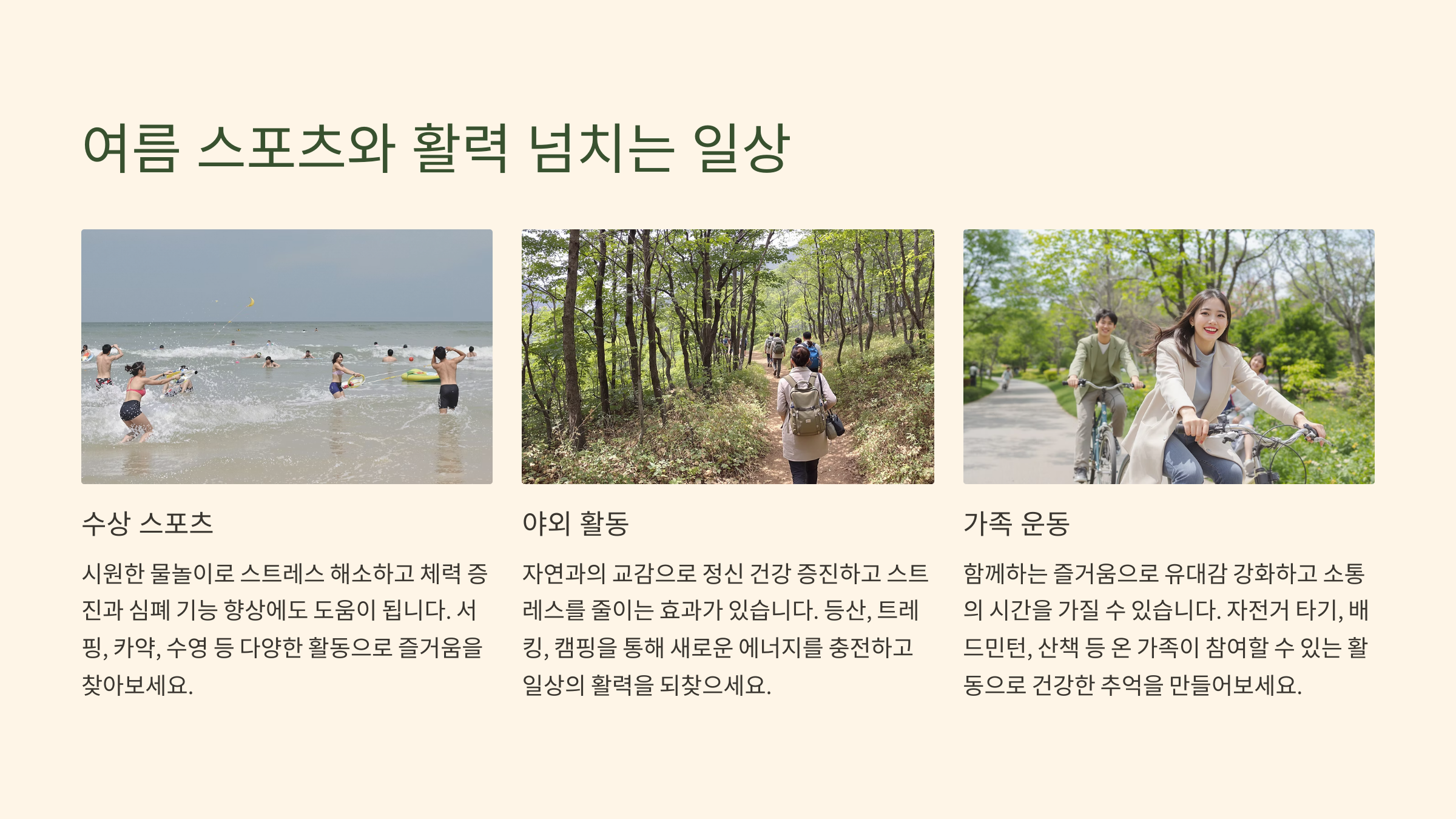 스포츠 활동은 신체 건강뿐만 아니라 정신 건강에도 매우 긍정적인 영향을 미칩니다. 규칙적인 운동은 스트레스를 해소하고 활력을 불어넣으며, 야외 활동은 자연과의 교감을 통해 감정적 위로를 줍니다. 여름철 다양한 스포츠를 통해 몸을 움직이거나 관람하는 것은 건강한 에너지를 충전하는 좋은 기회가 됩니다. 활기찬 스포츠 활동으로 삶의 질을 높이고 건강한 여름을 보내시길 바랍니다.