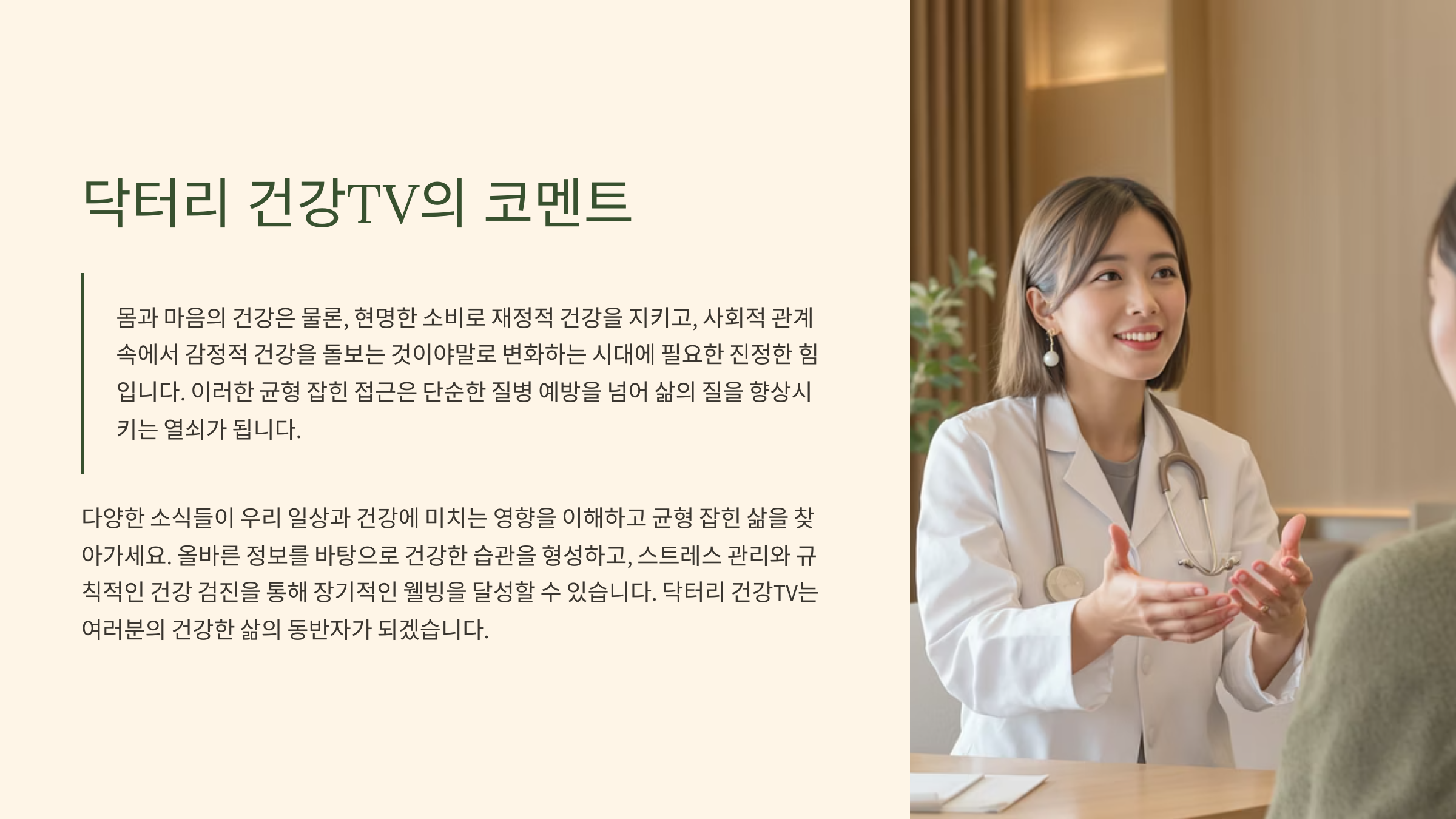 닥터리 건강TV는 이러한 흐름 속에서 여러분이 건강한 균형을 찾아갈 수 있도록 돕는 길잡이가 되고자 합니다.