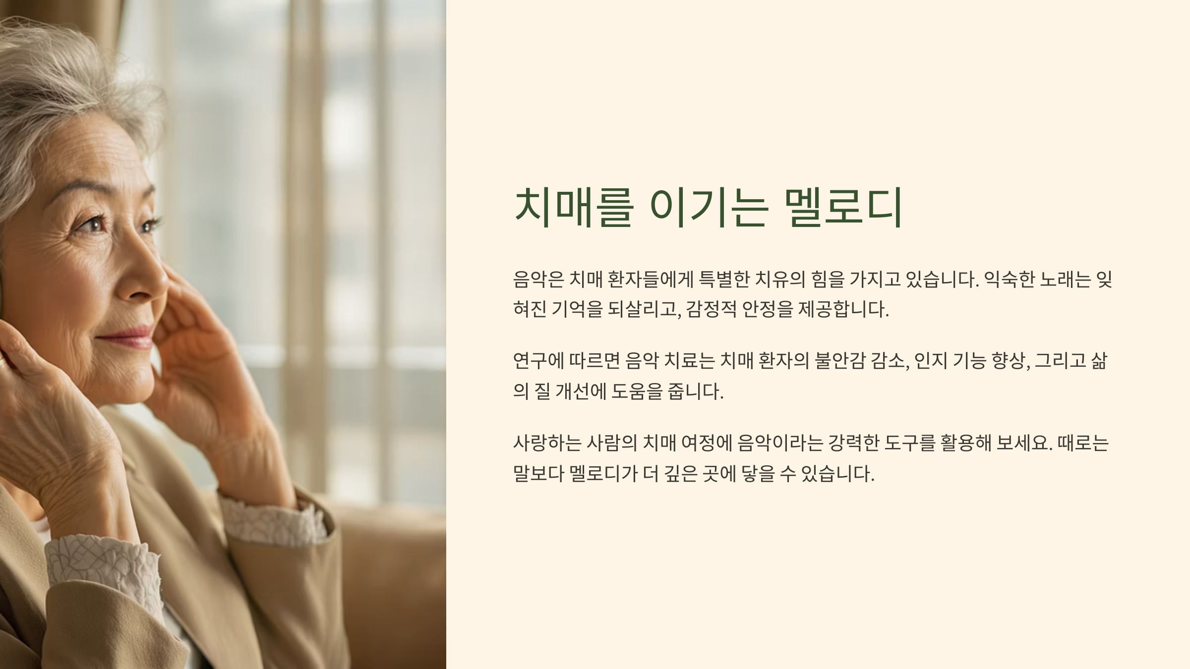 음악 치료는 치매 환자와 보호자 모두를 힘들게 하는 행동심리증상을 관리하는 데 매우 효과적인 비약물적 개입 방법입니다. 익숙하고 안정적인 멜로디는 혼란스러운 환자의 내면을 진정시키는 힘이 있습니다.