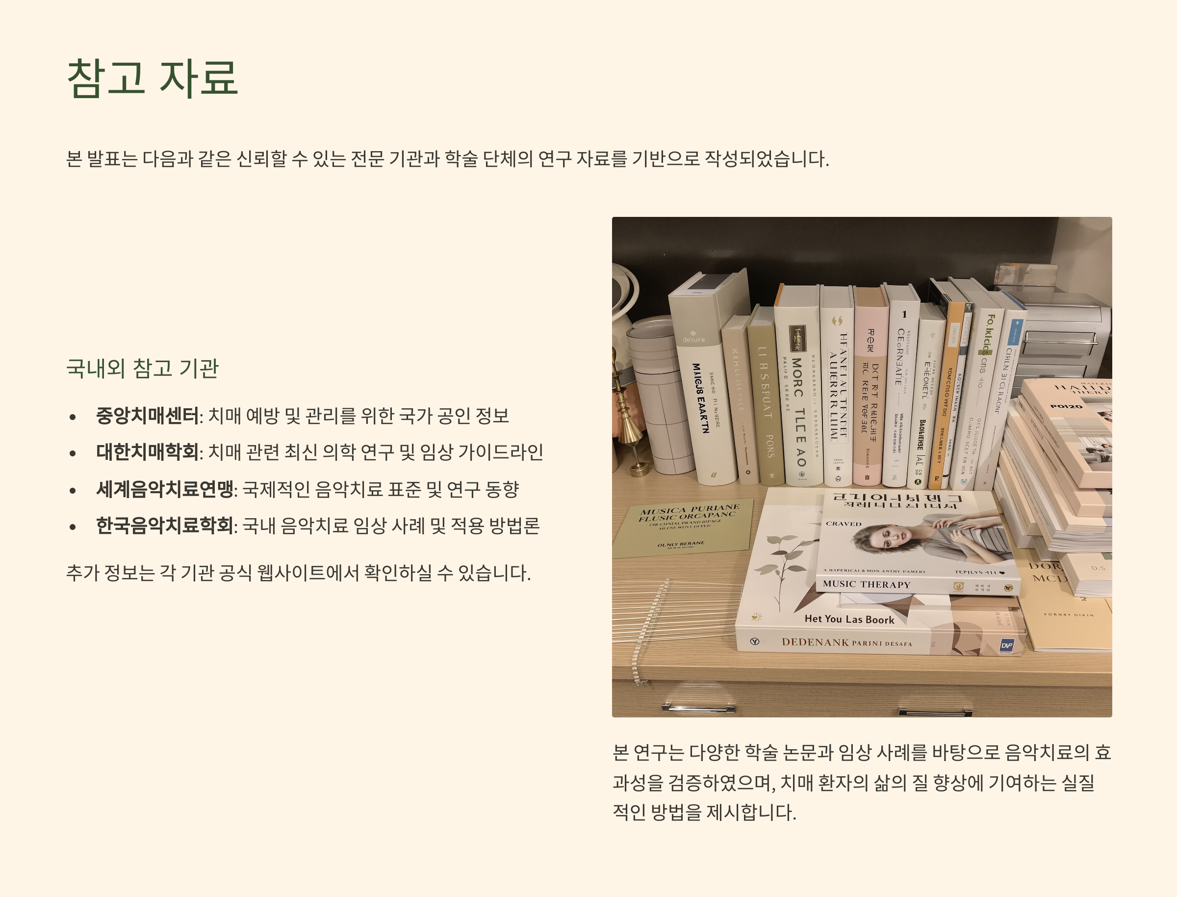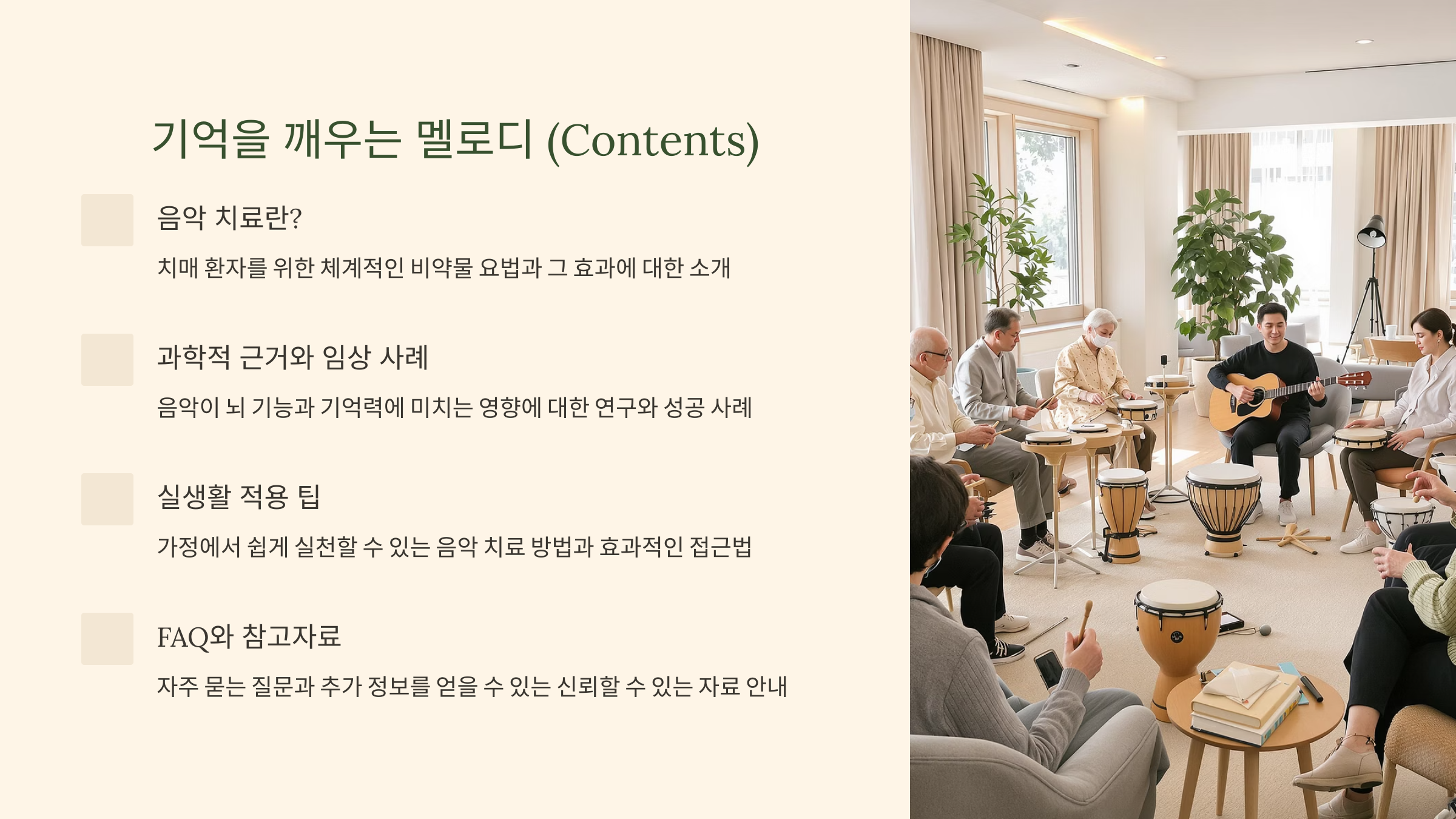 이 글은 신뢰할 수 있는 국내외 치매 및 음악치료 관련 기관의 자료를 바탕으로 작성되었습니다.